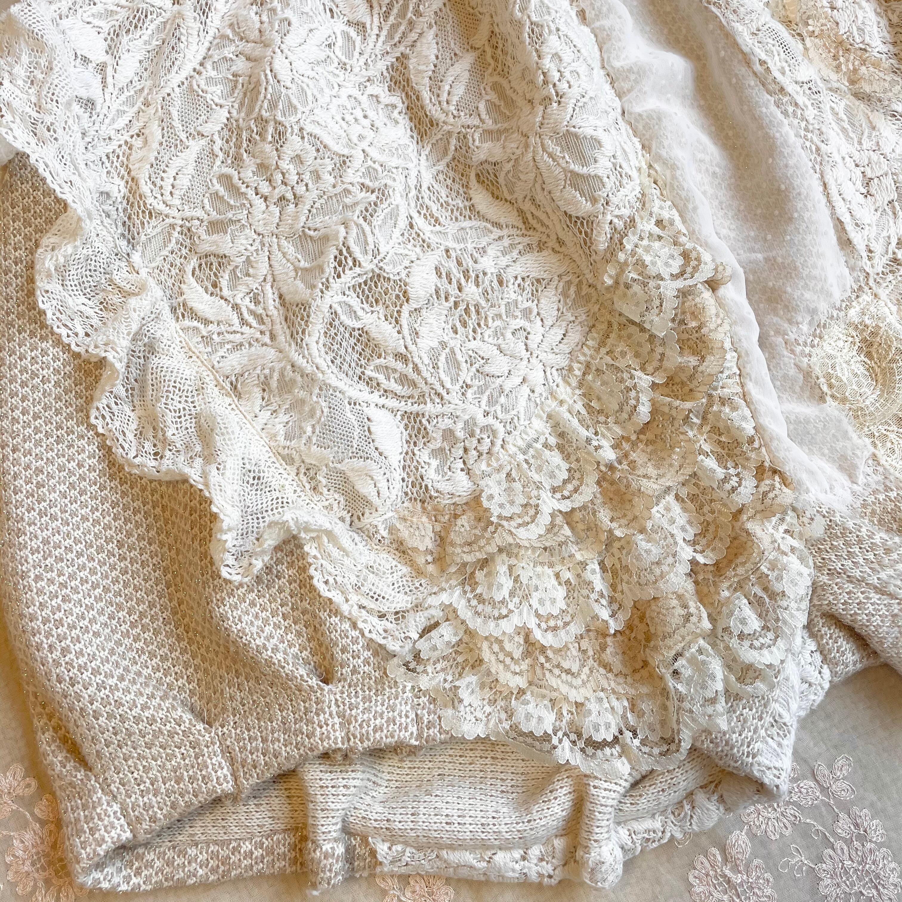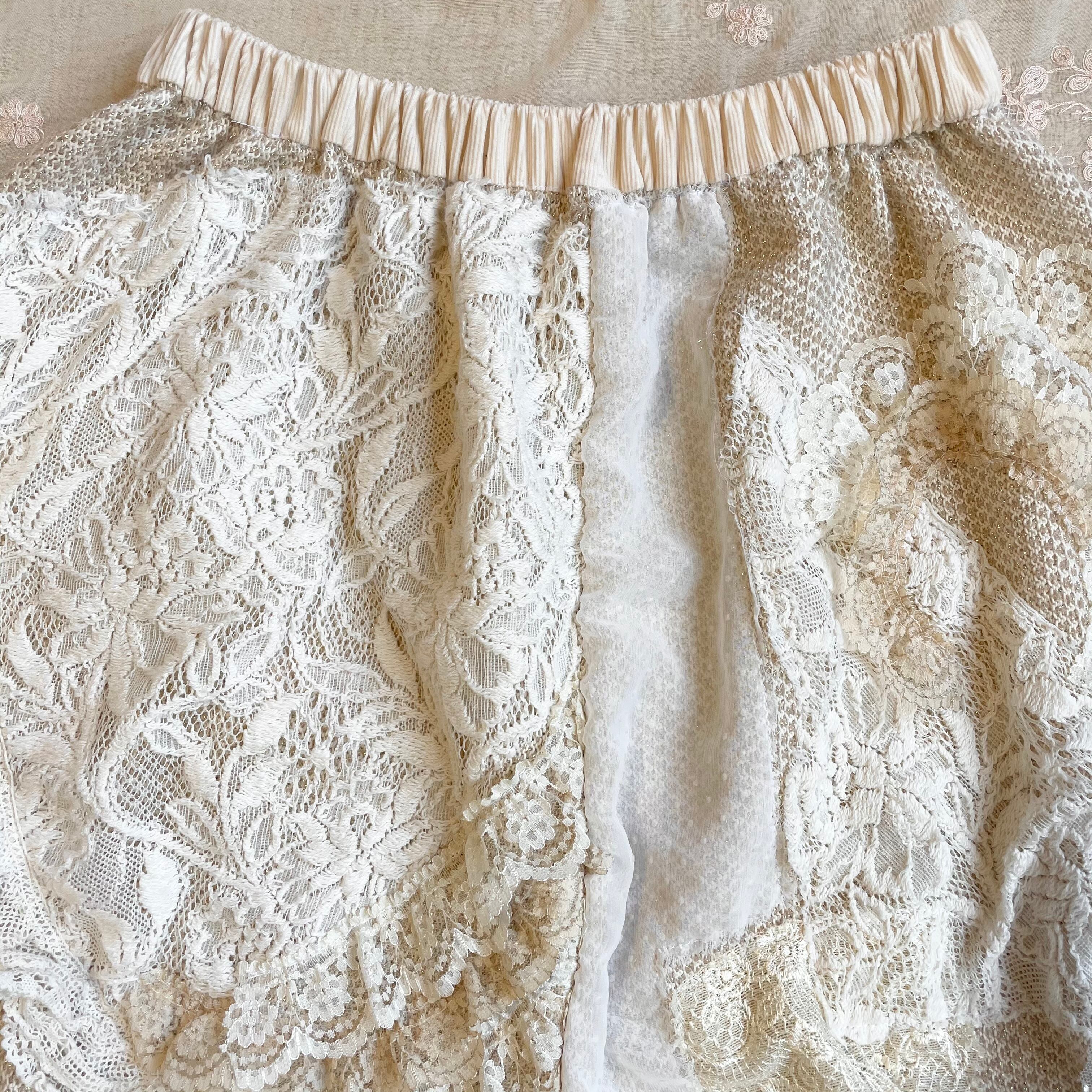 いろんなお洋服のレースやニット生地をコラージュしたかぼちゃぱんつ。