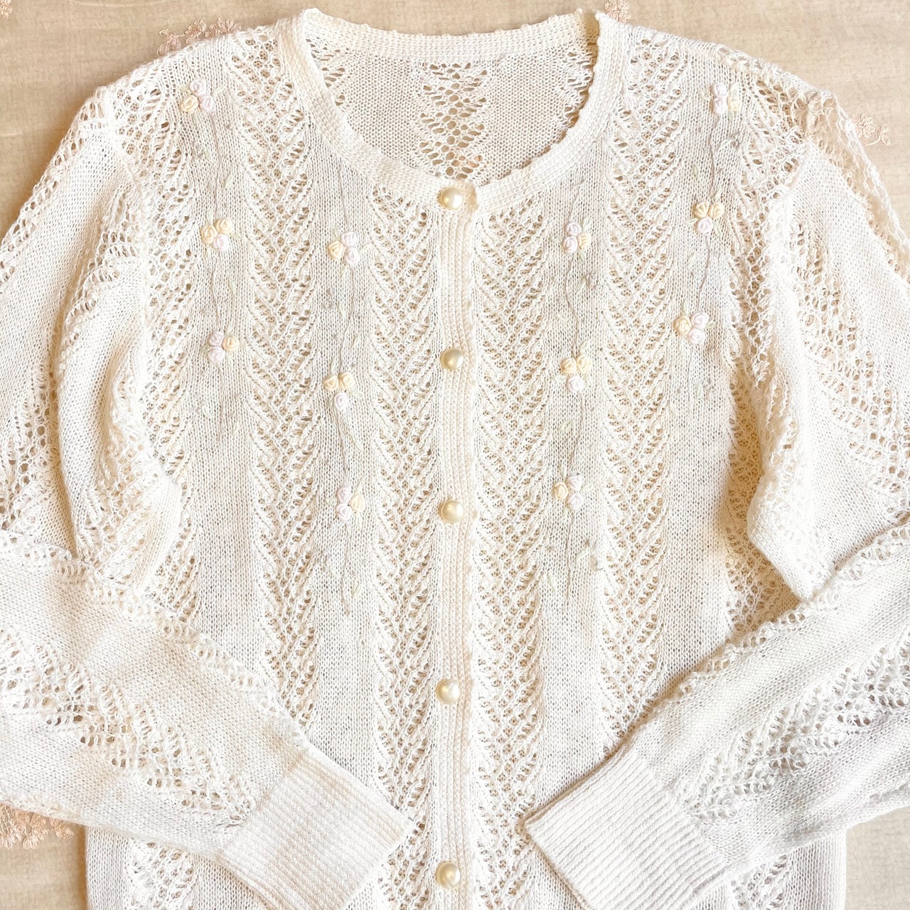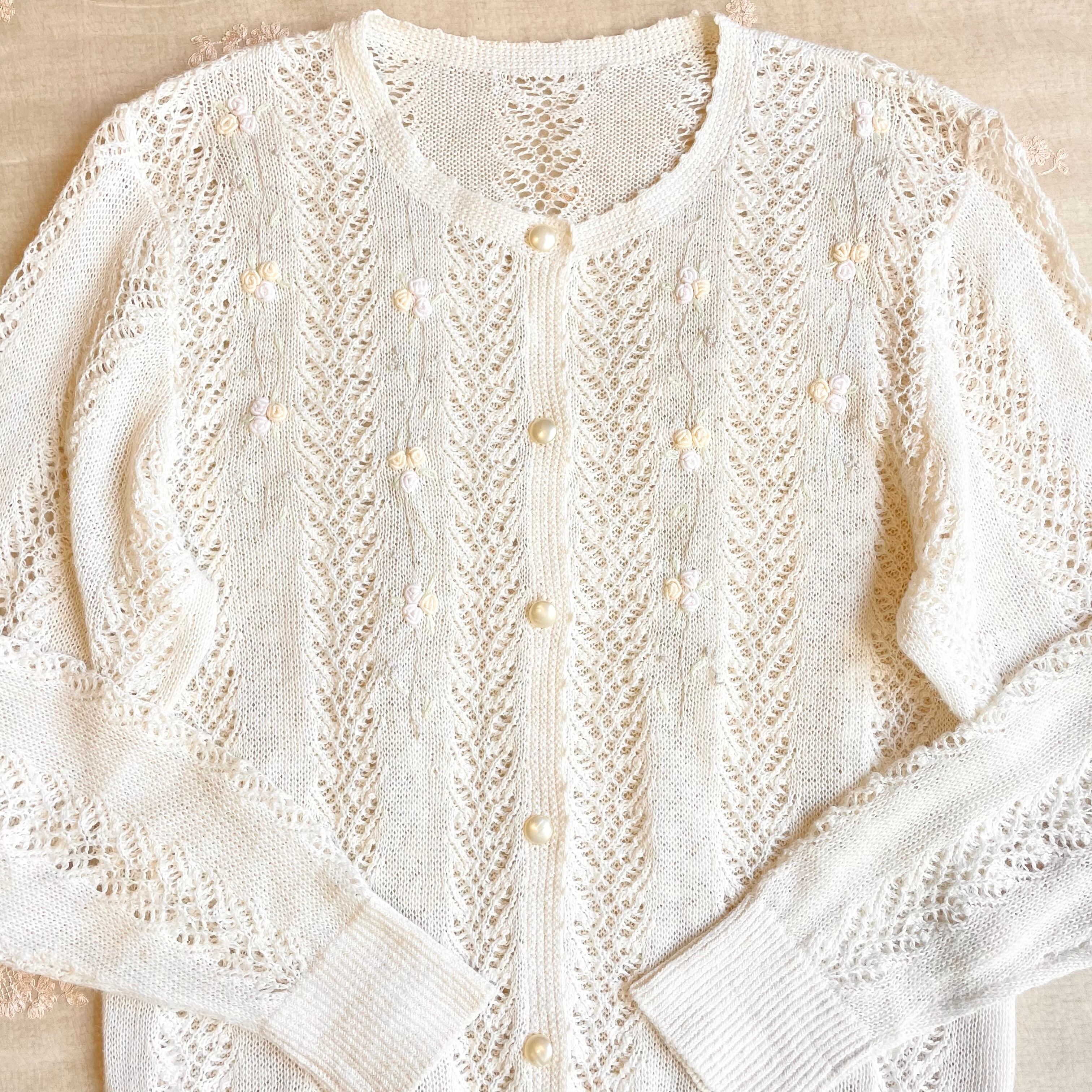 オフホワイトに淡いカラーの立体お花刺繍が可愛すぎるカーディガン。