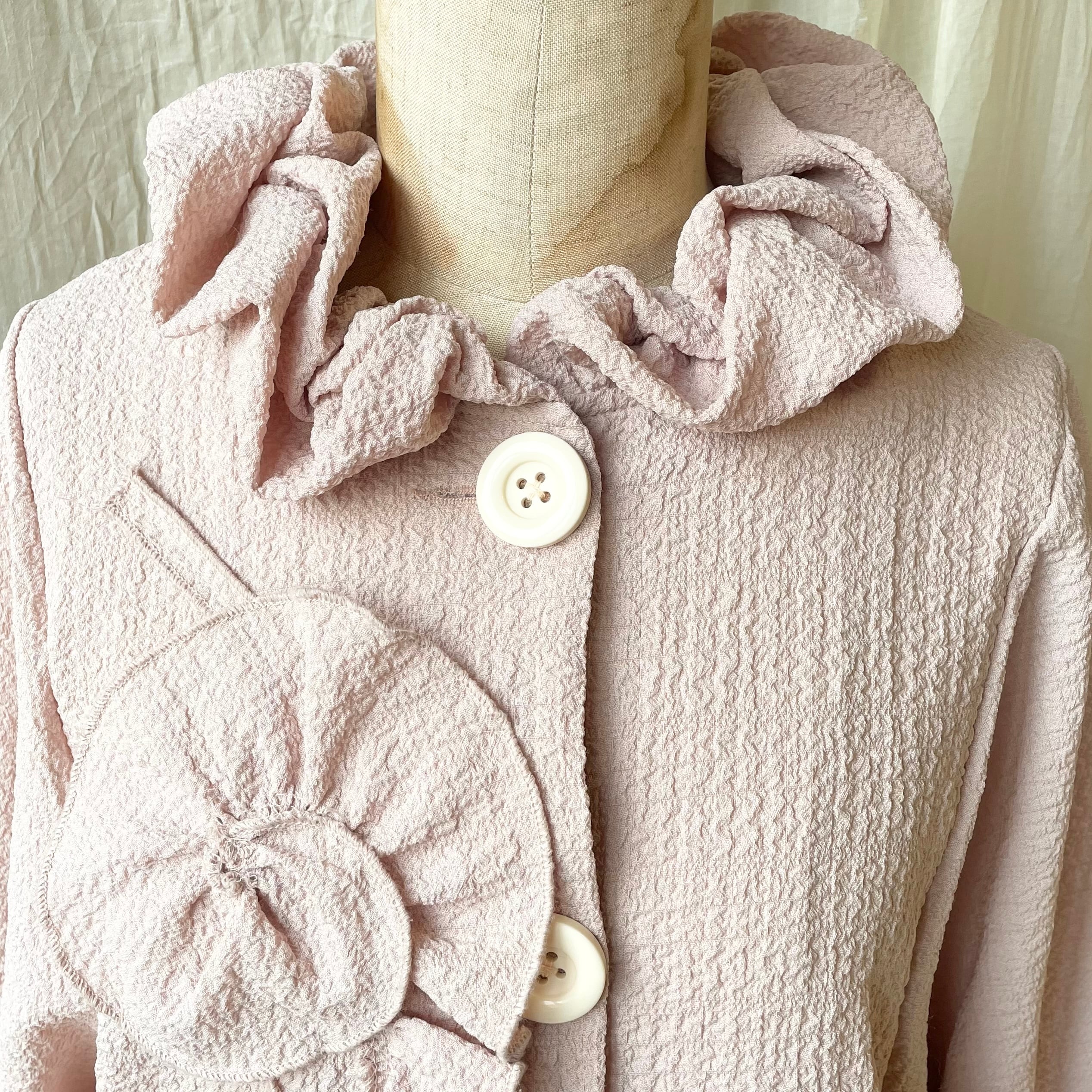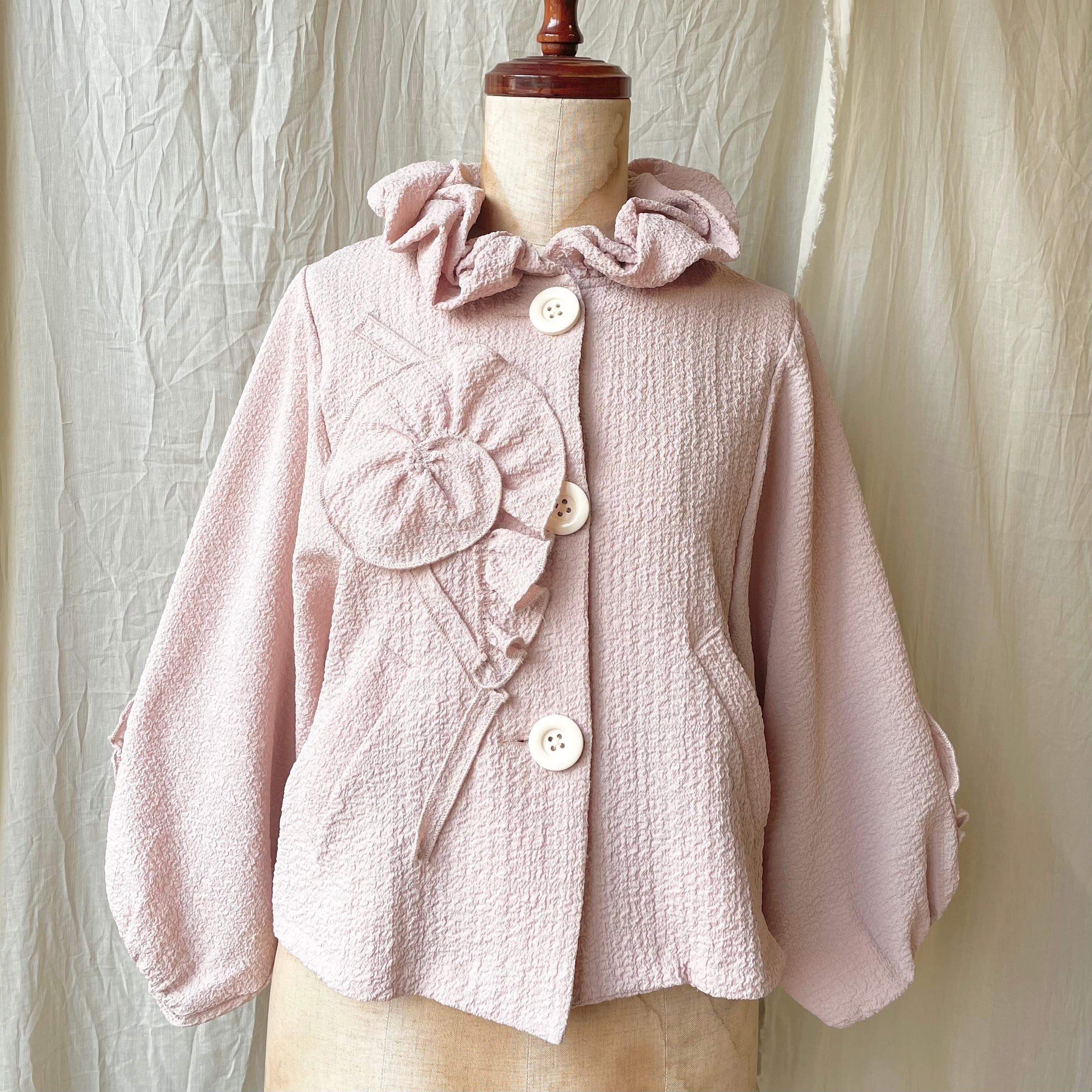 フリルたっぷりのボリューム襟にオフホワイトの大きなボタンが3つ並んでいます。