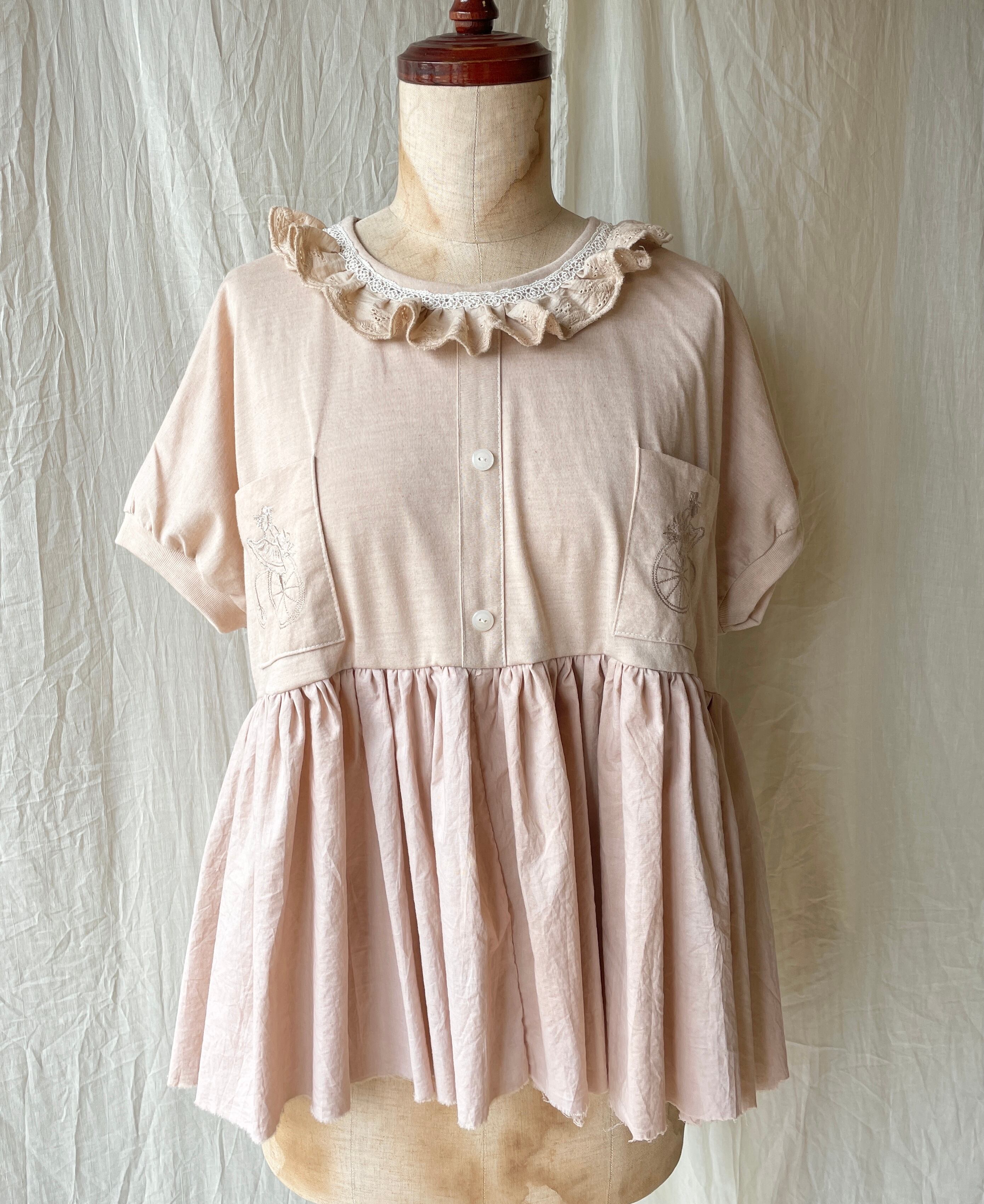 女の子の刺繍が入ったポッケが可愛いusedカットソーをリメイクしたトップス。
