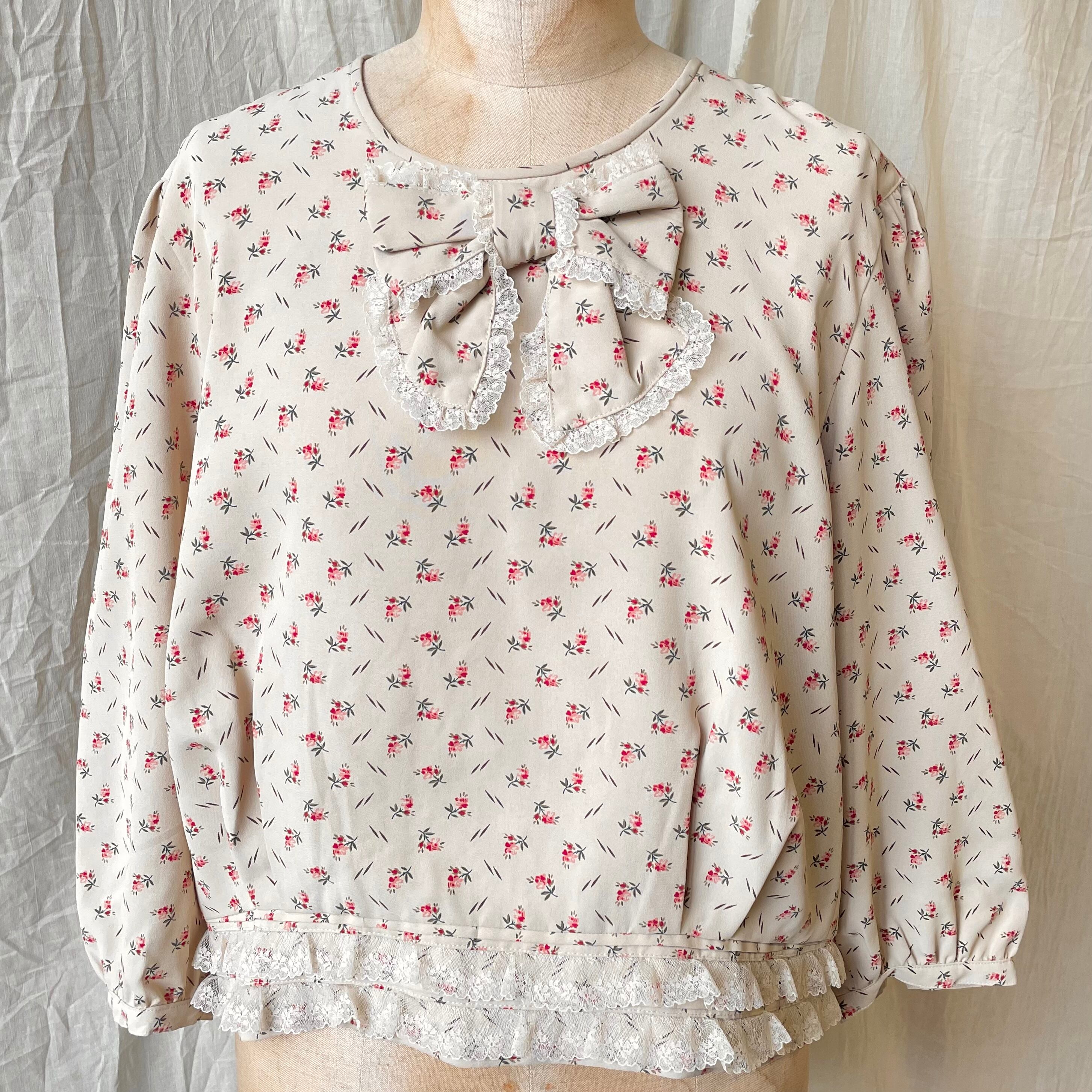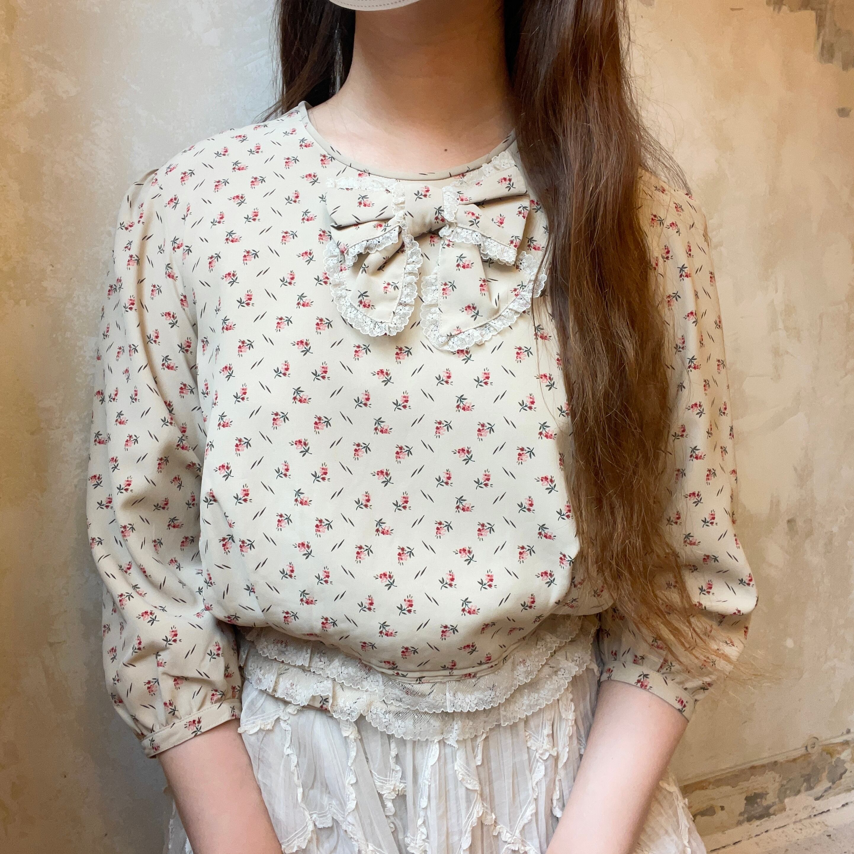 ベージュに赤系の小花柄が可愛いブラウス 。