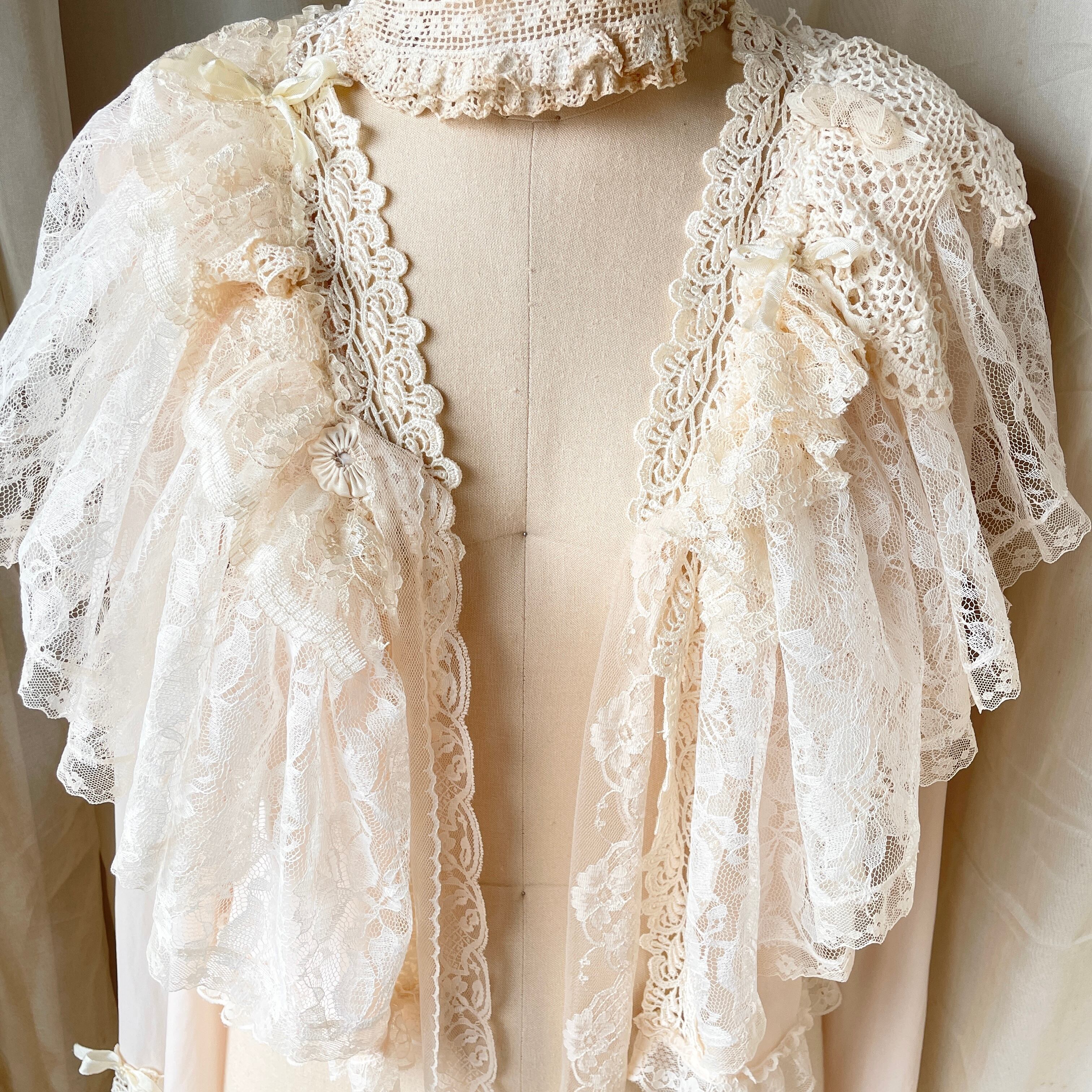 淡いほんのりピンクの柔らかい透け感のある生地にvintage素材や生成り系のレースを組み合わせた装飾がとっても繊細で可愛いです。