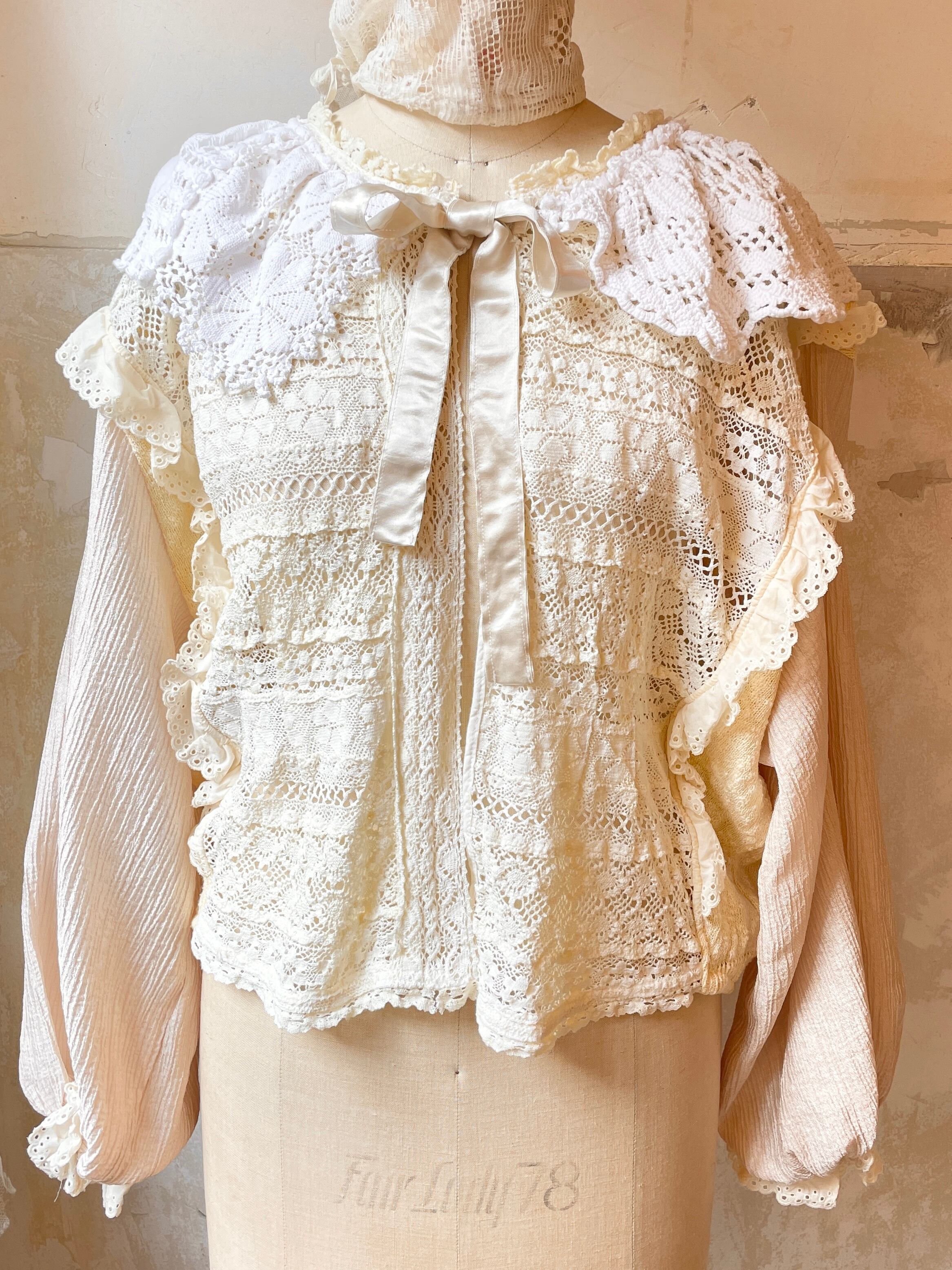 淡いレモンクリーム色のレースやサマーニットのブラウスをメインにいろんなお洋服の生地で制作したカーディガン。