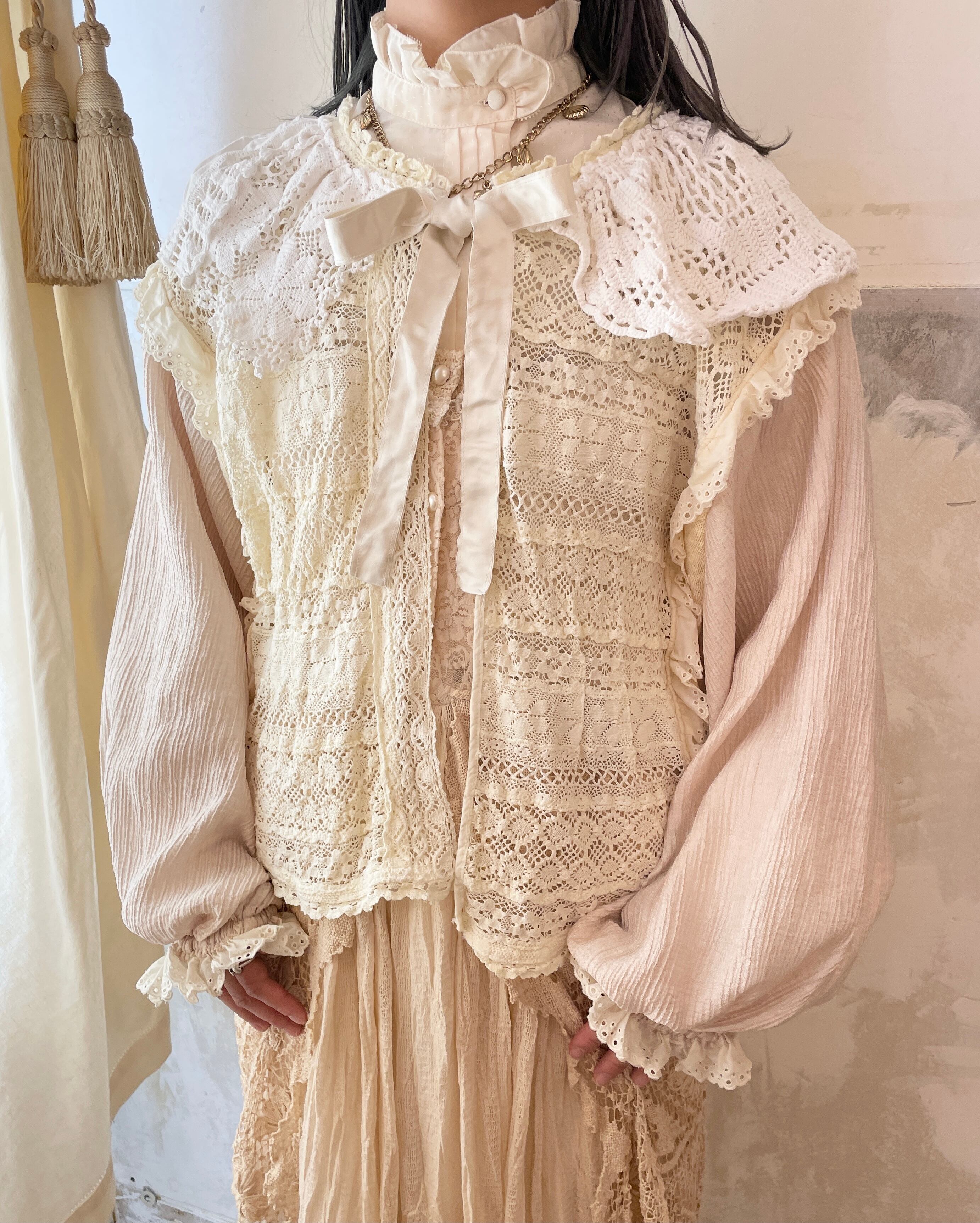 vintageレースの大きな襟や後ろセンターがボタンになっていて開けることができるリメイクならではの遊び心のあるデザインもとても可愛いです。