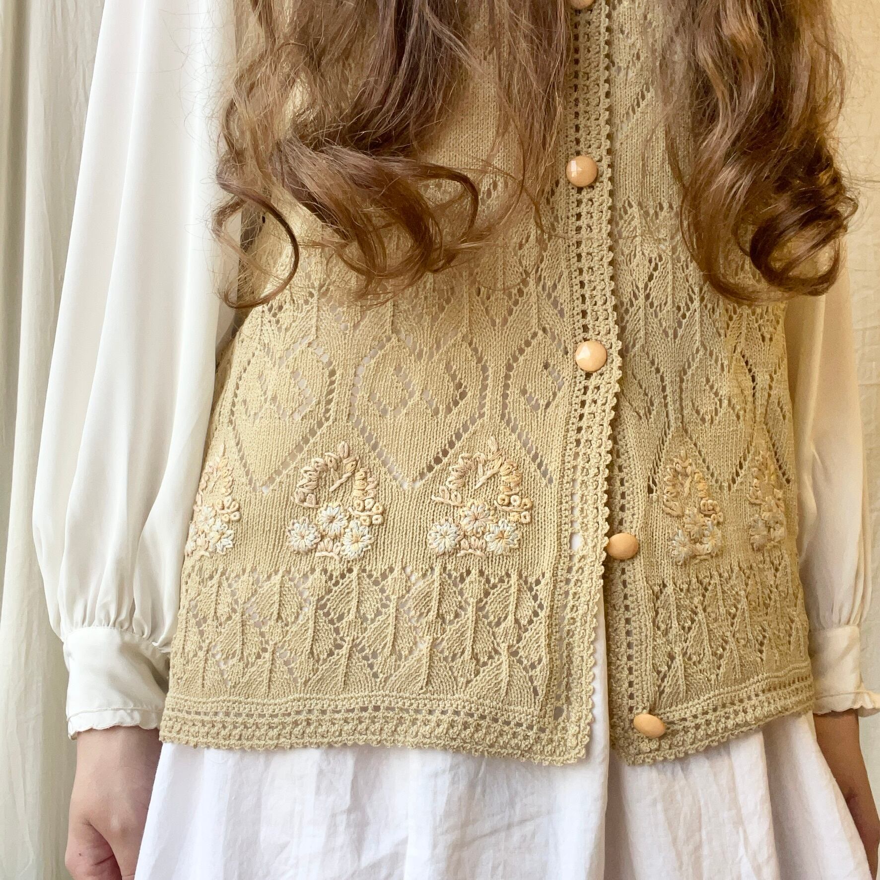 裾のお花刺繍がぐるりと可愛いニットベスト。