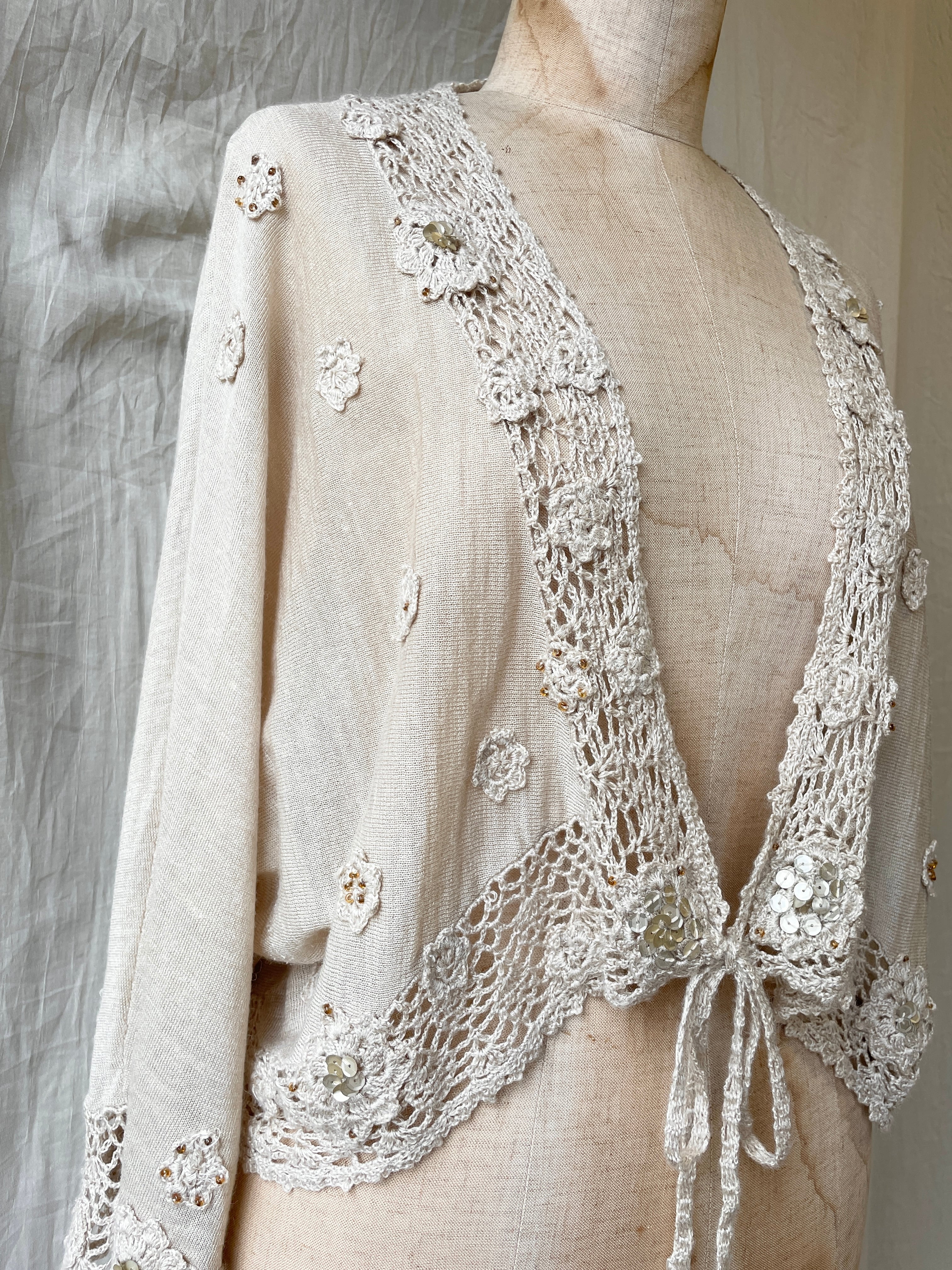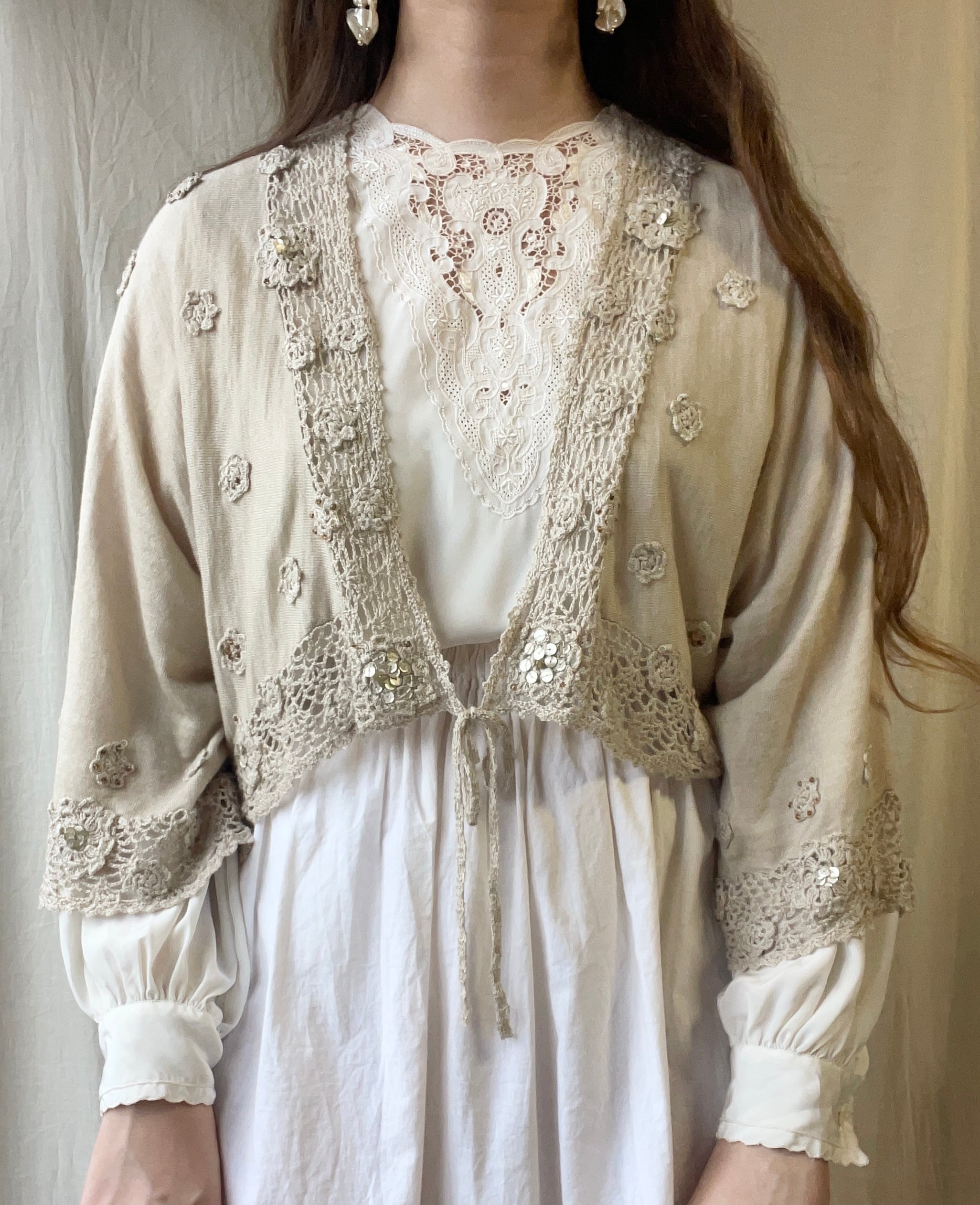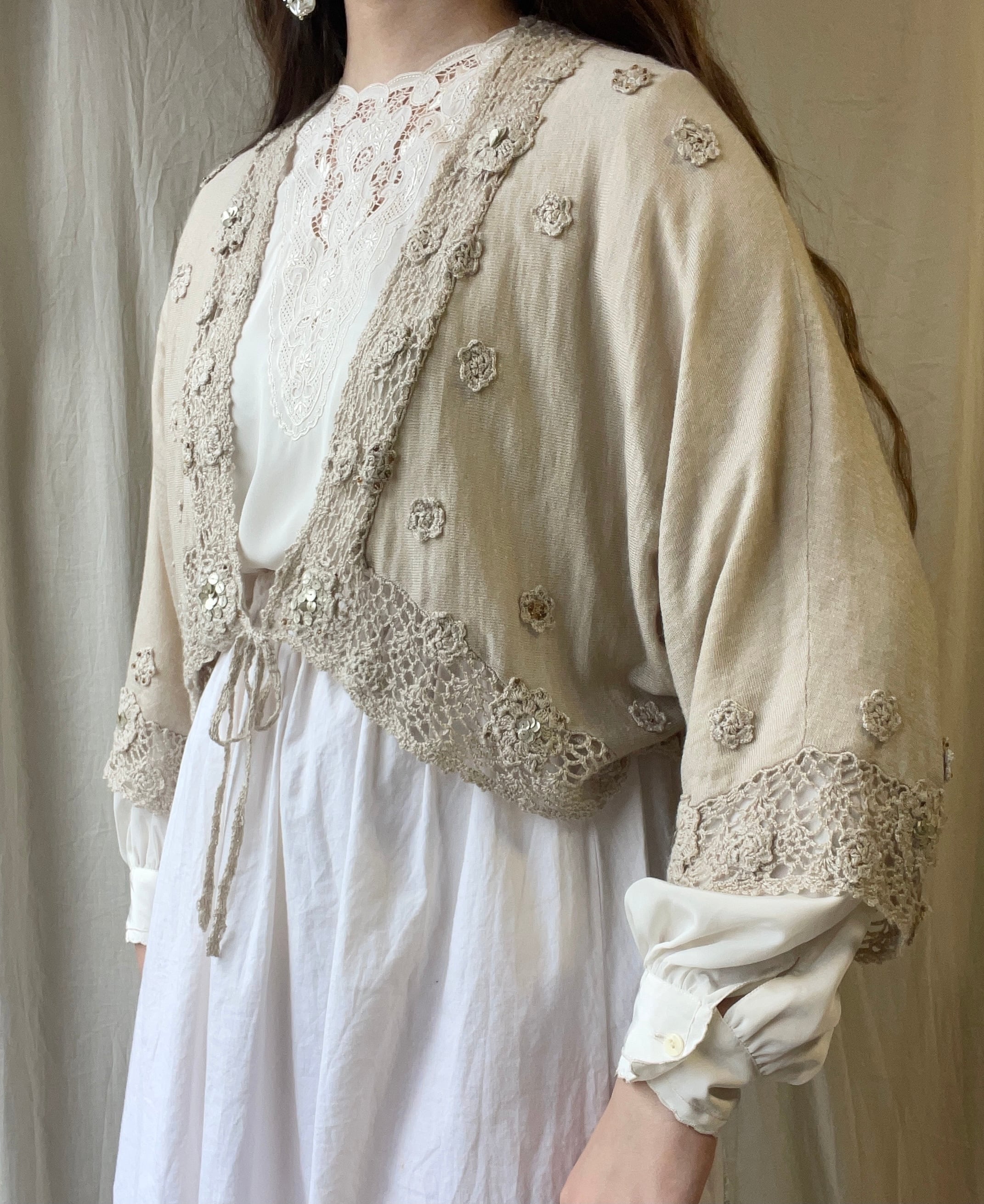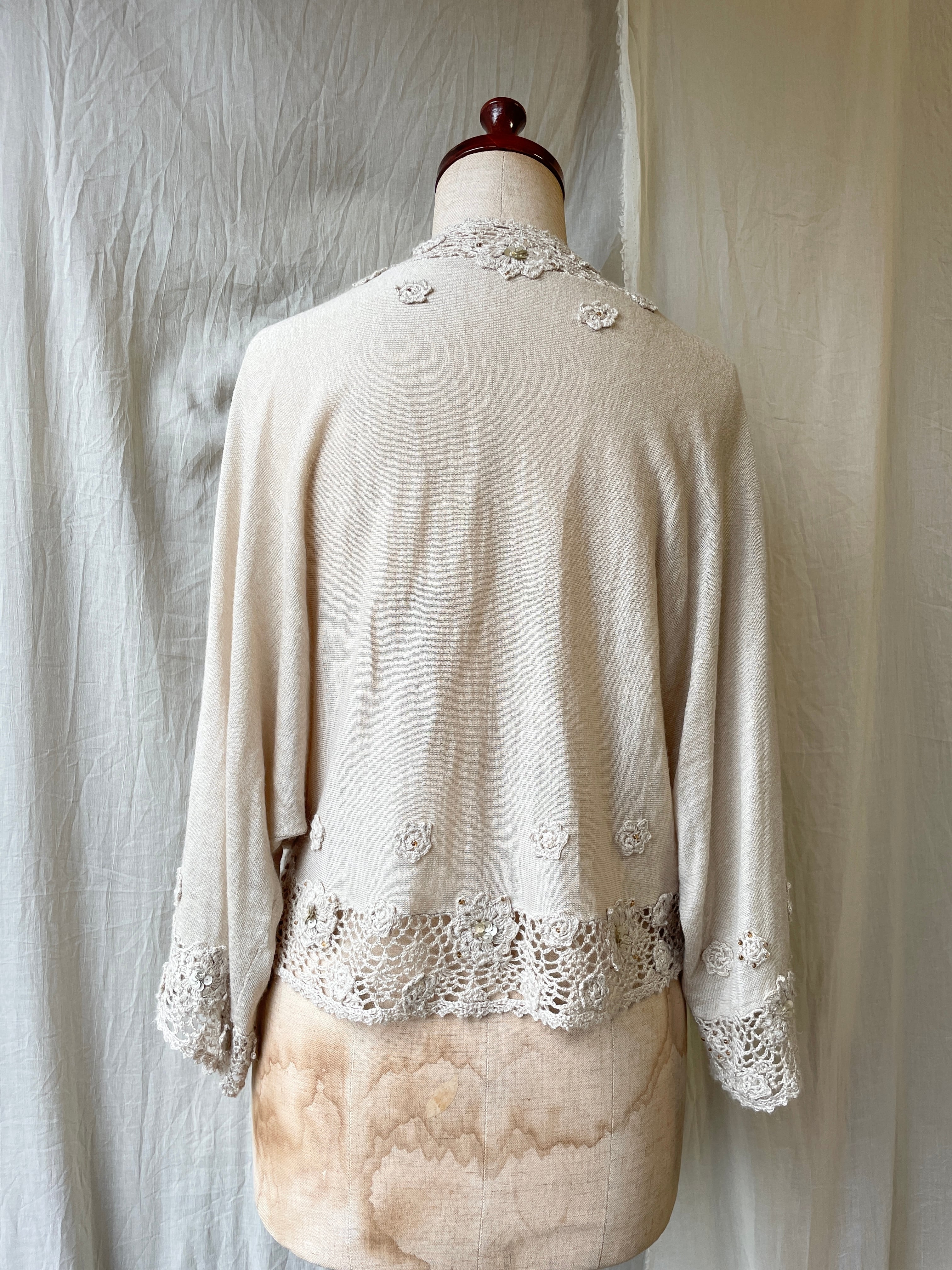 アッシュ系のベージュに小さなお花モチーフやビーズ刺繍が前後にたくさん散りばめられた、どこを見ても可愛いニットカーディガン。