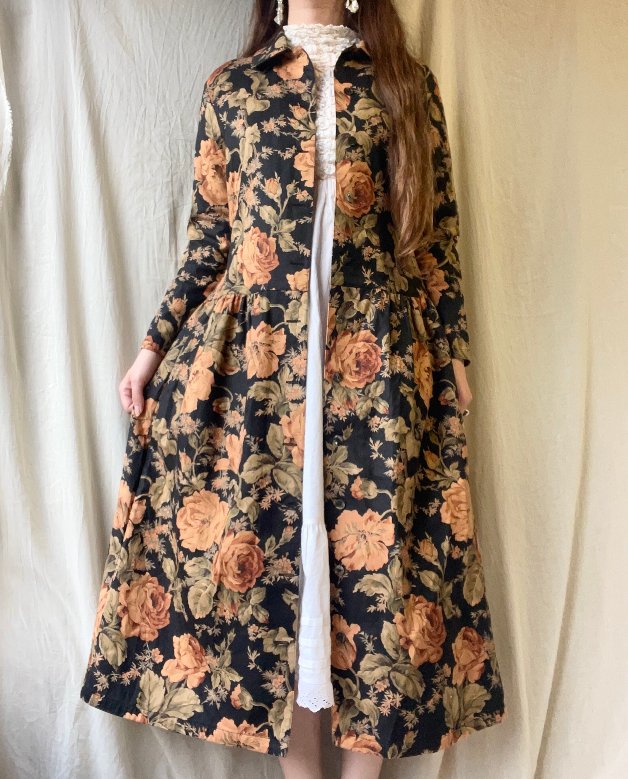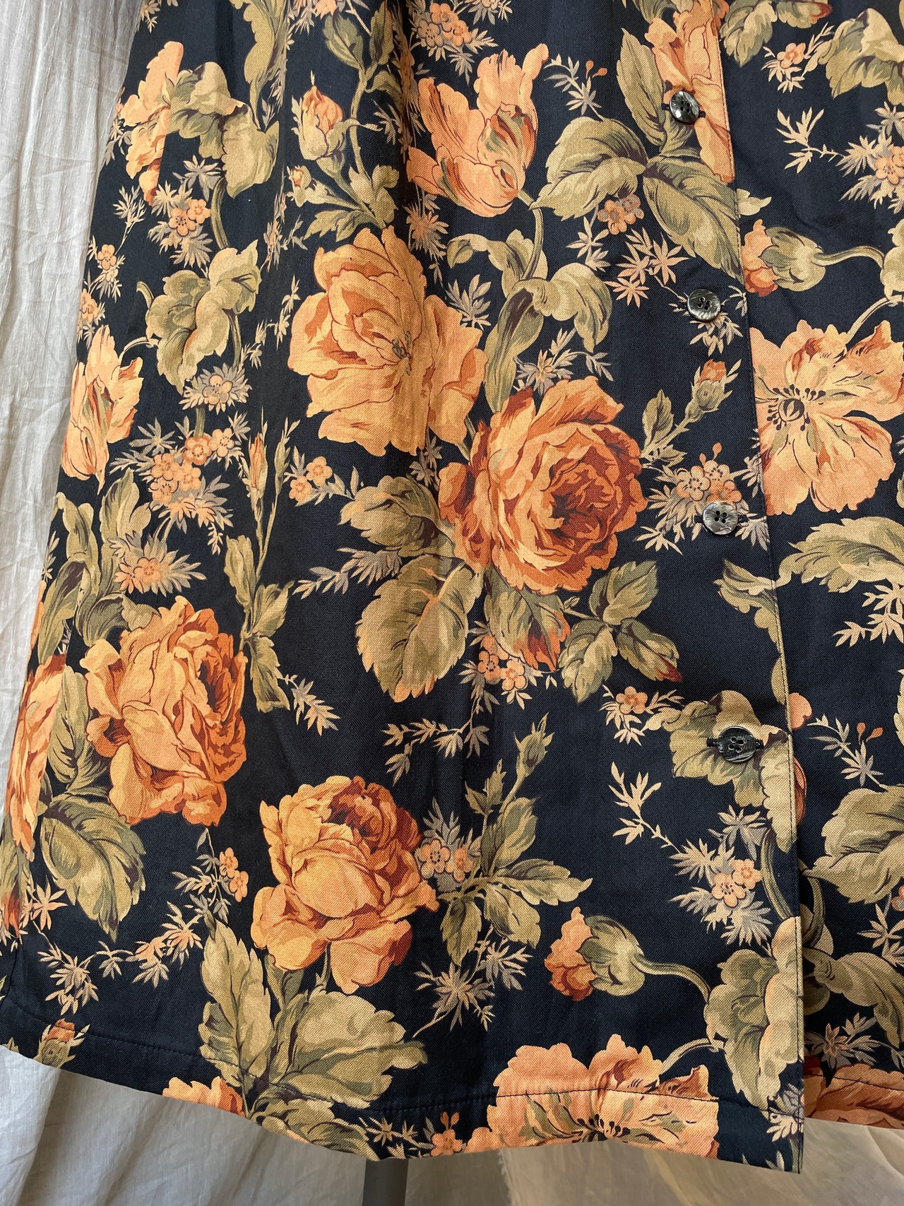 黒地にオレンジブラウンの薔薇模様が美しいワンピース。
