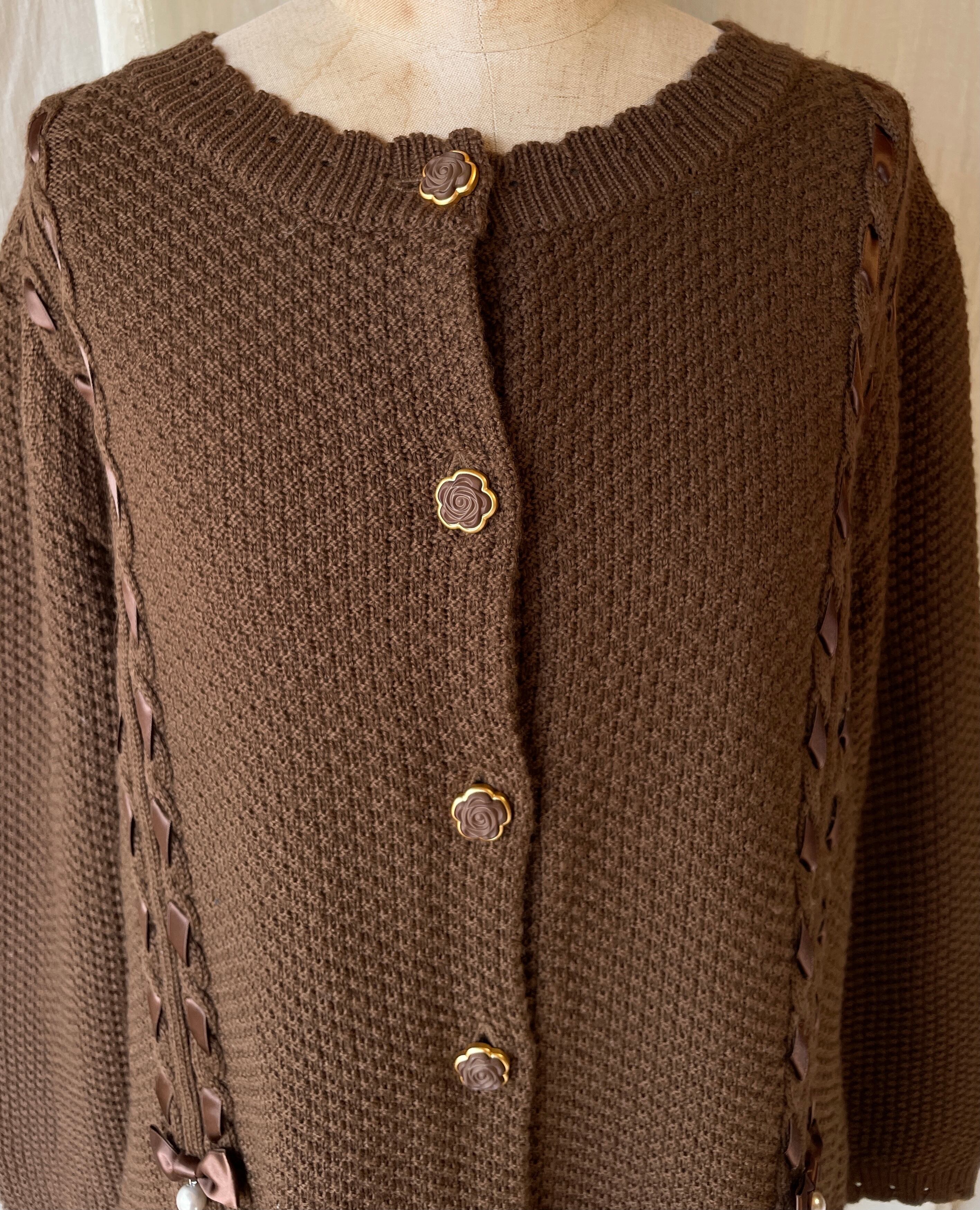 薔薇のボタンとリボンの編み込みがとっても可愛いウールニットカーディガン。