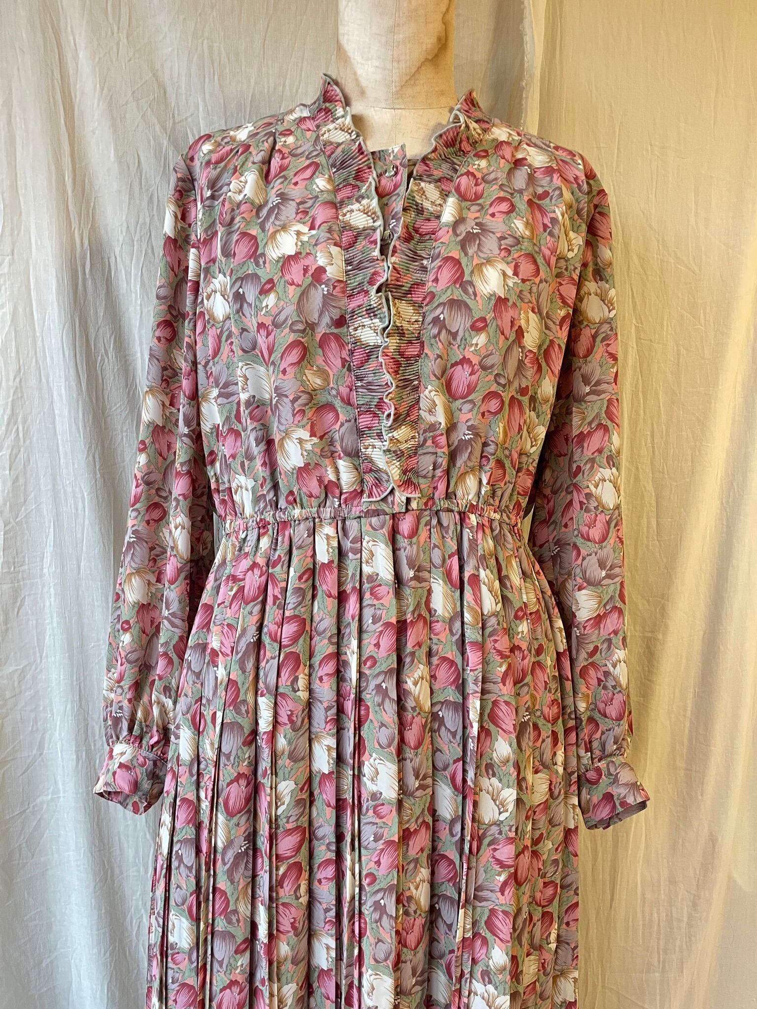 くすみピンク系のチューリップ模様が可愛いワンピース。