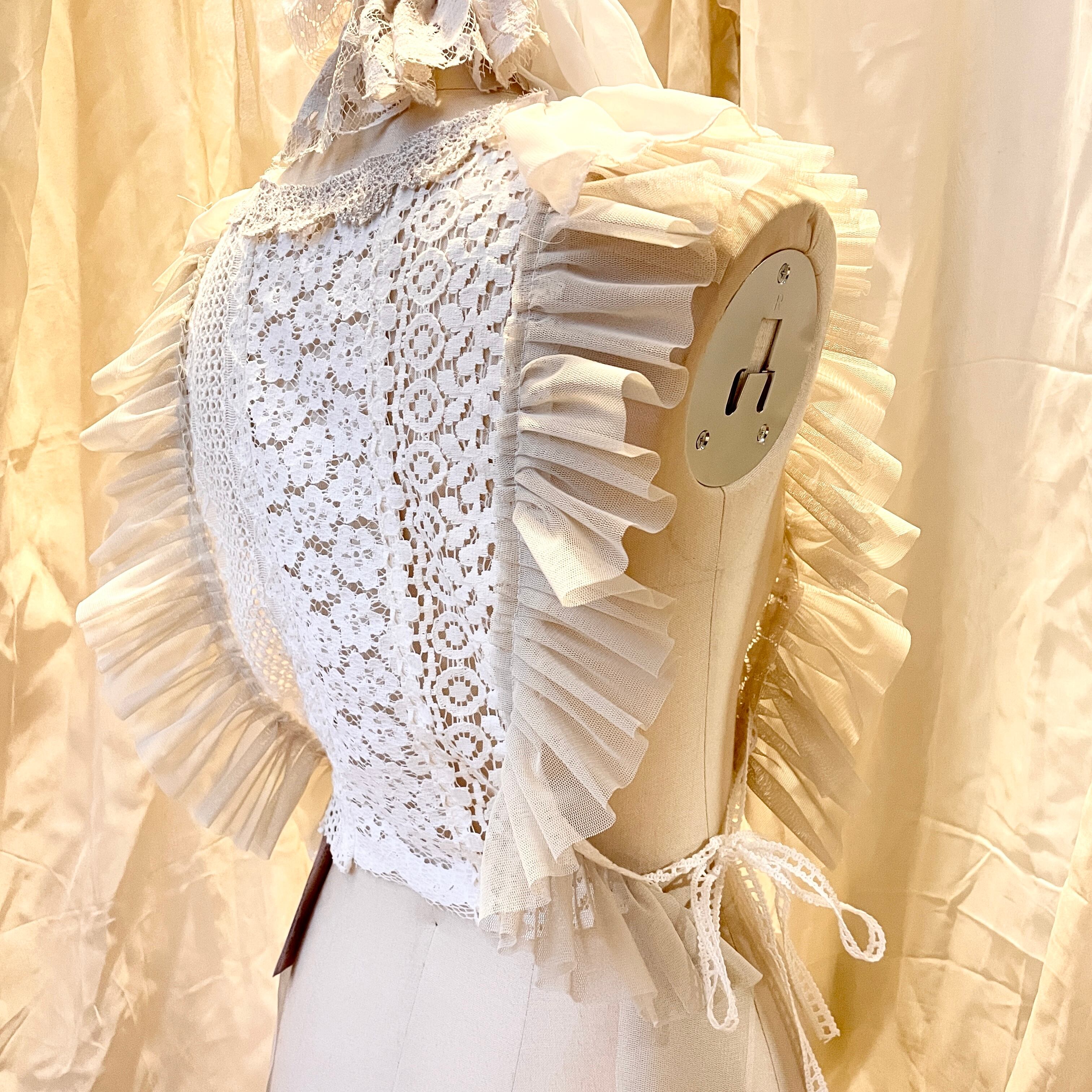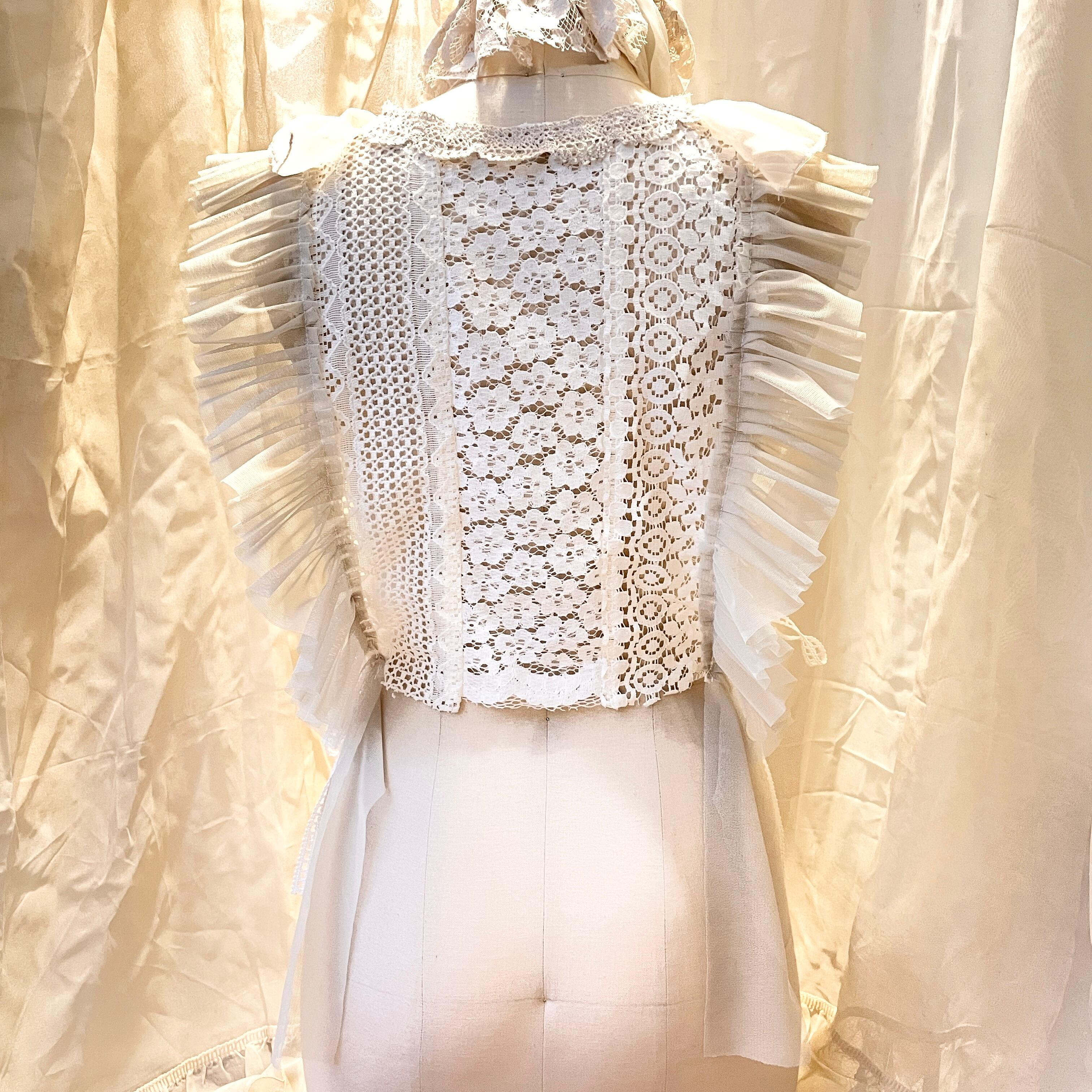 両サイドのリボンの結び具合で身幅を調整できるのでニットやブラウス、一年中いろんなお洋服に重ねて着用できます。