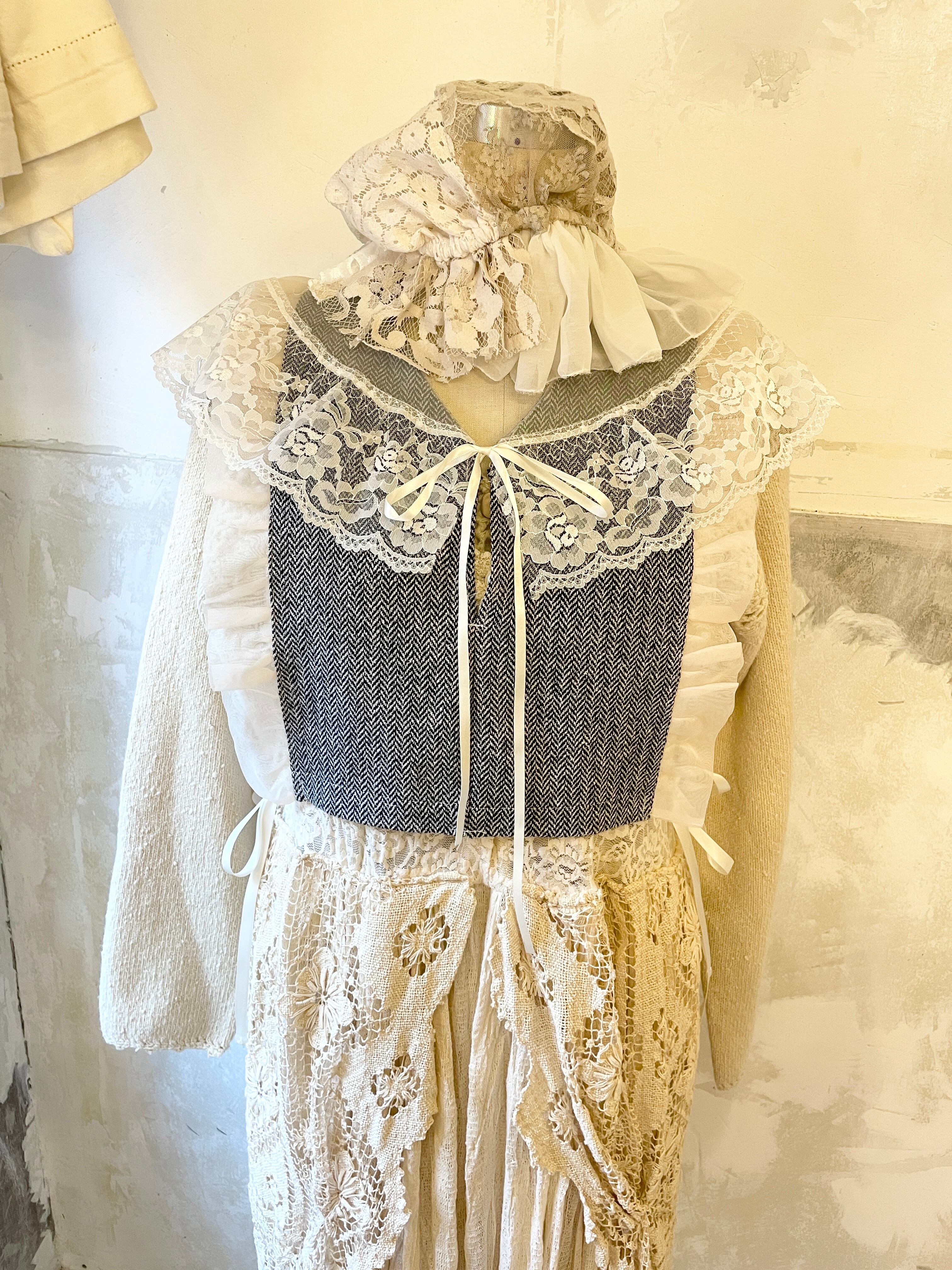 両サイドのリボンの結び具合で身幅を調整できるのでニットやブラウス、一年中いろんなお洋服に重ねて着用できます。