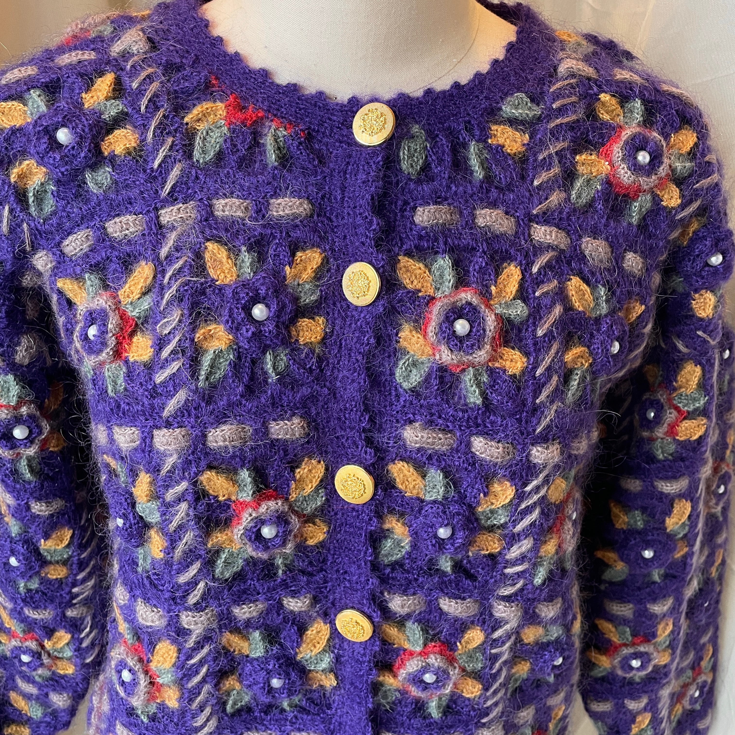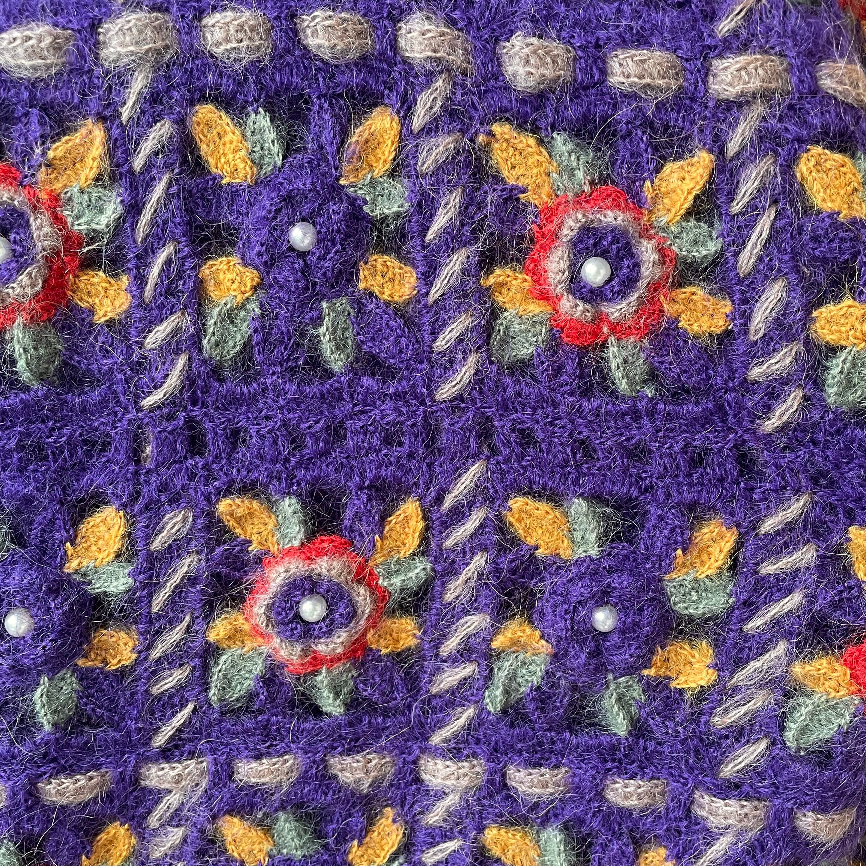 パッチワークみたいな編み模様が可愛いウールカーディガン 。