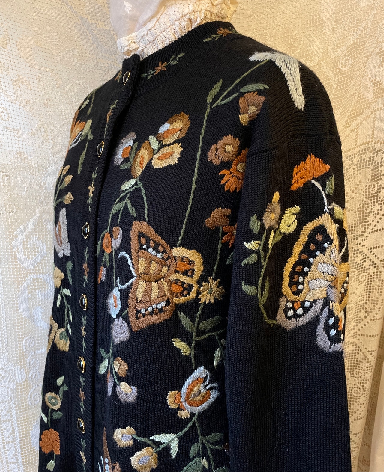蝶々やお花刺繍が可愛いウールカーディガン 。