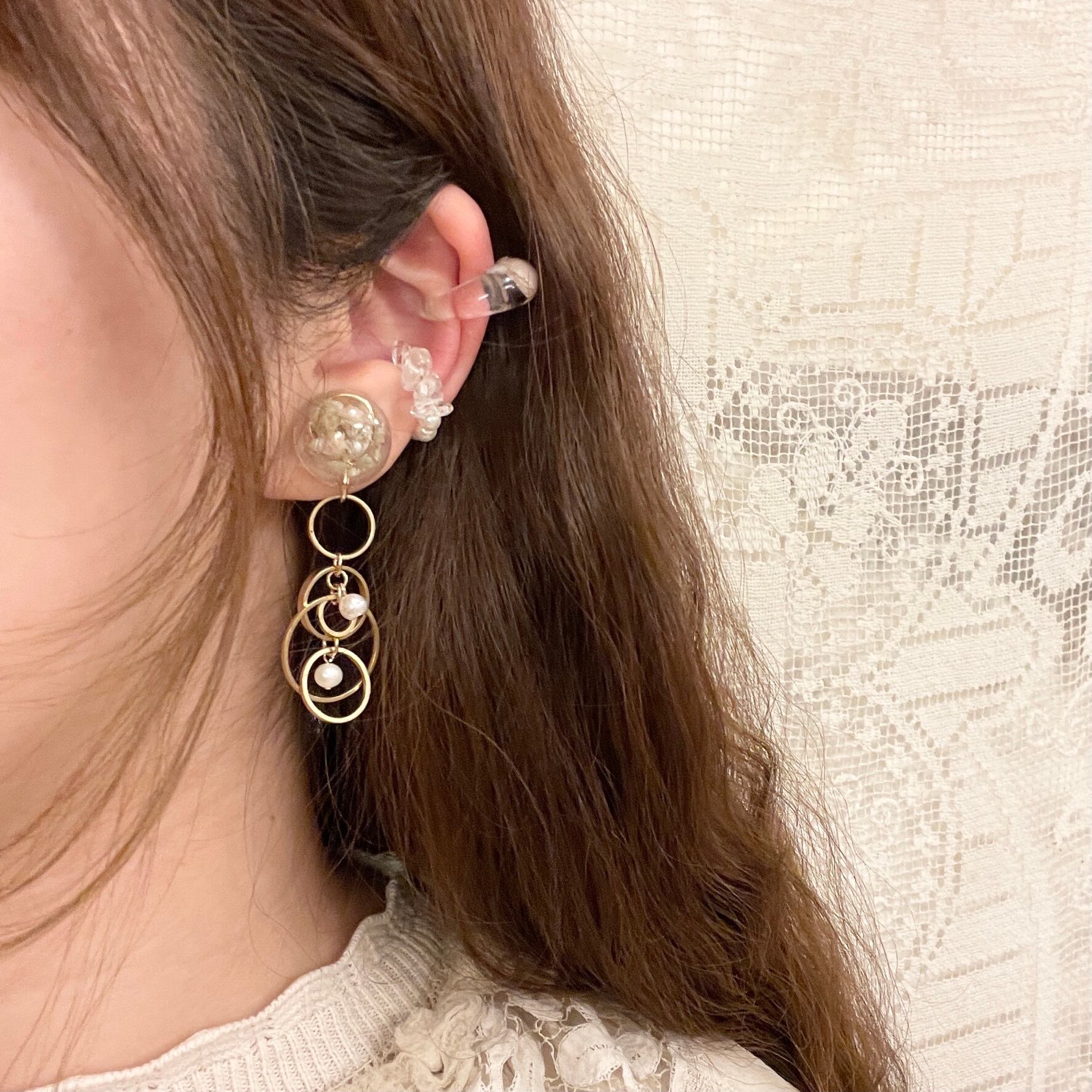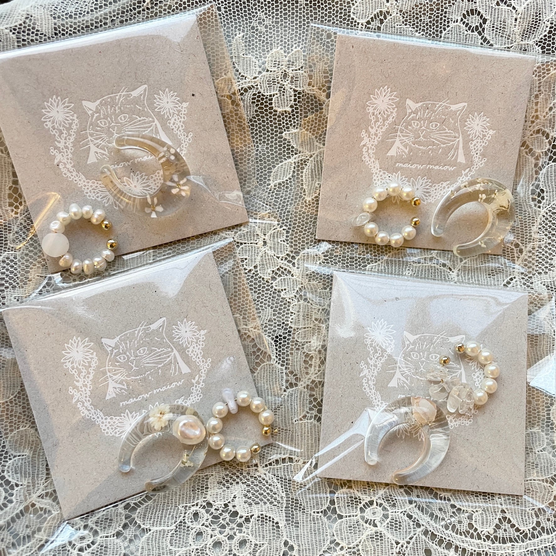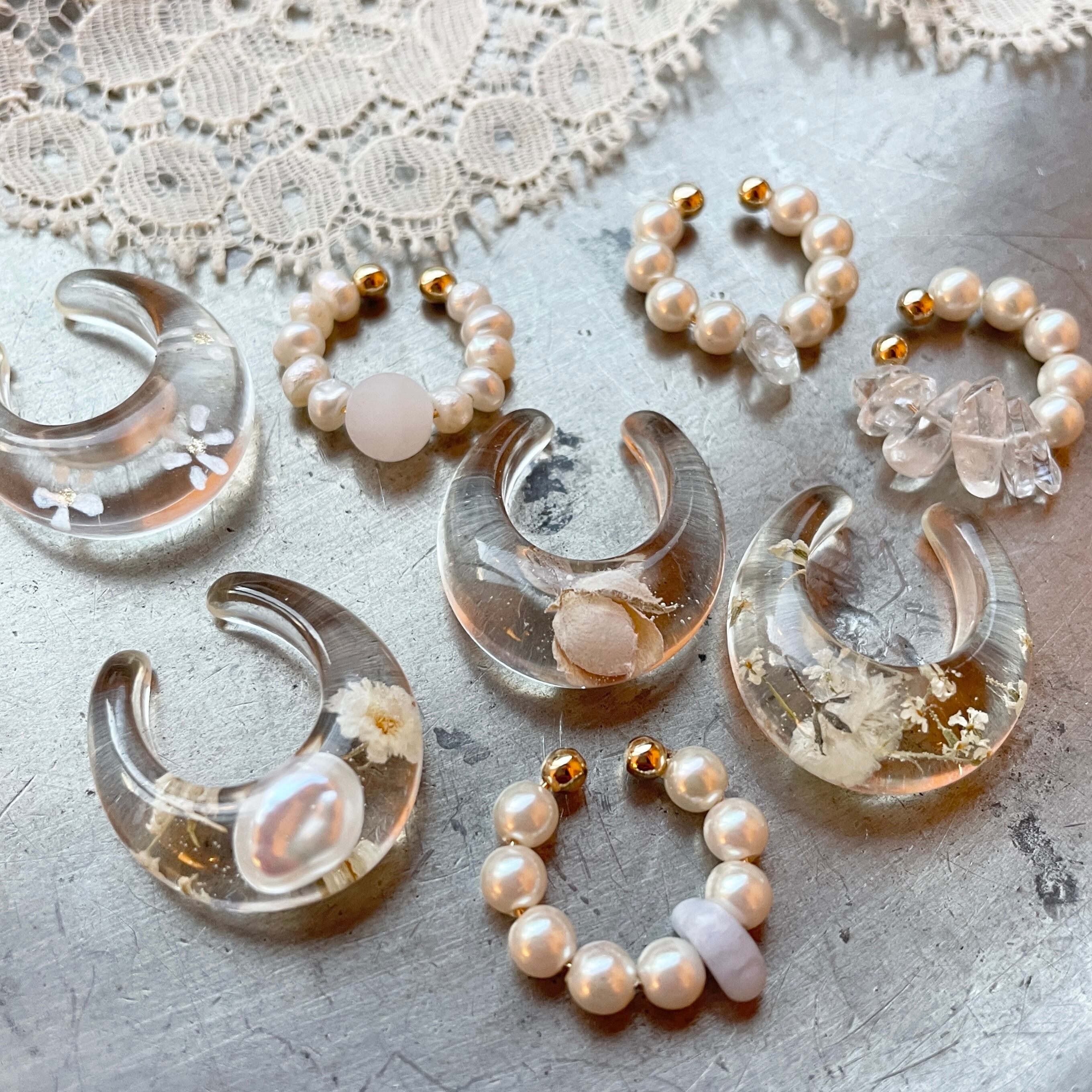 ドライフラワーやパール等を閉じ込めたり、ペイントでお花を描いたり、オリジナルパーツが可愛いイヤーカフとパールやビーズのイヤーカフの2点set。