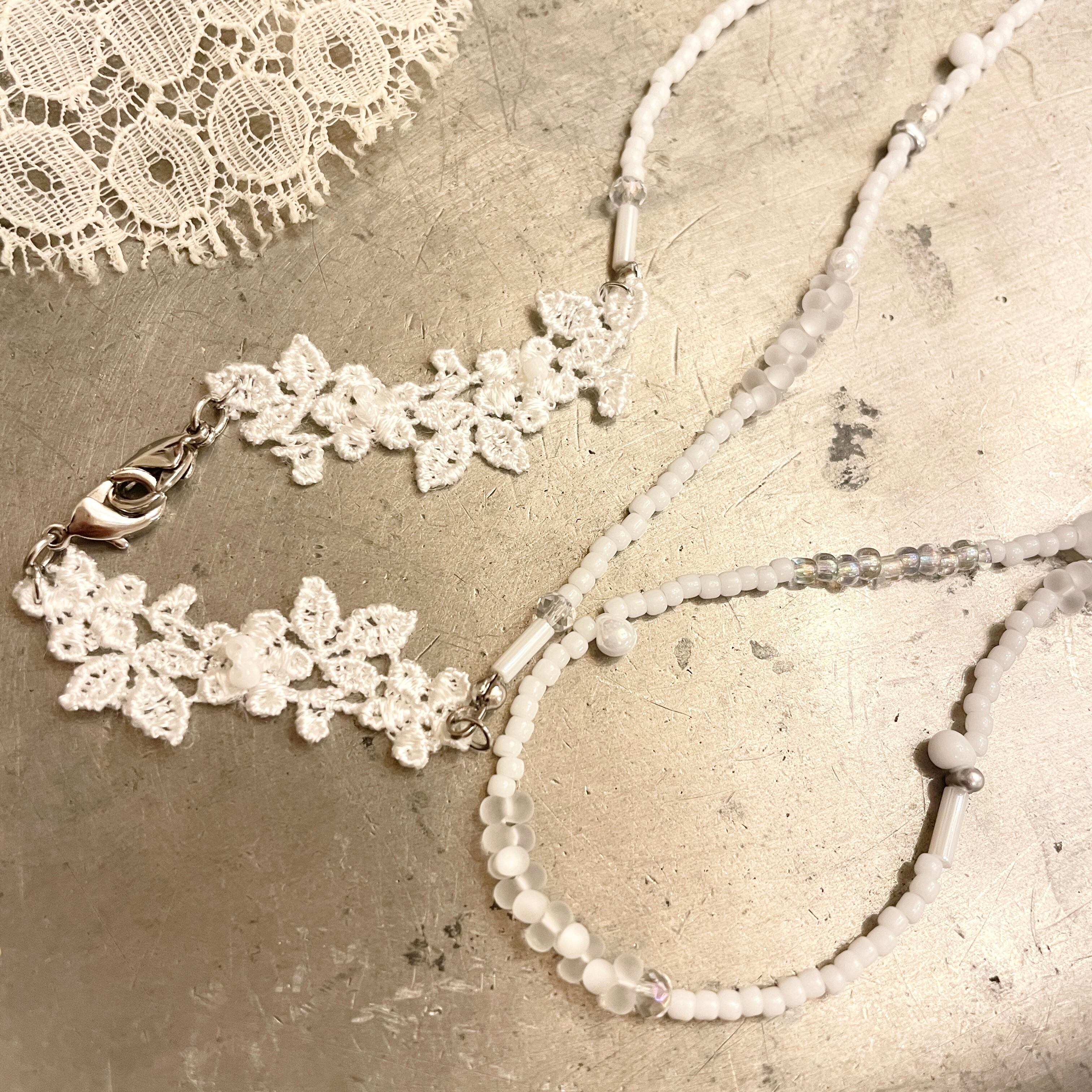 手作業でレースやいろんな種類のホワイトビーズを繋いだ繊細なデザインのマスクチェーン。