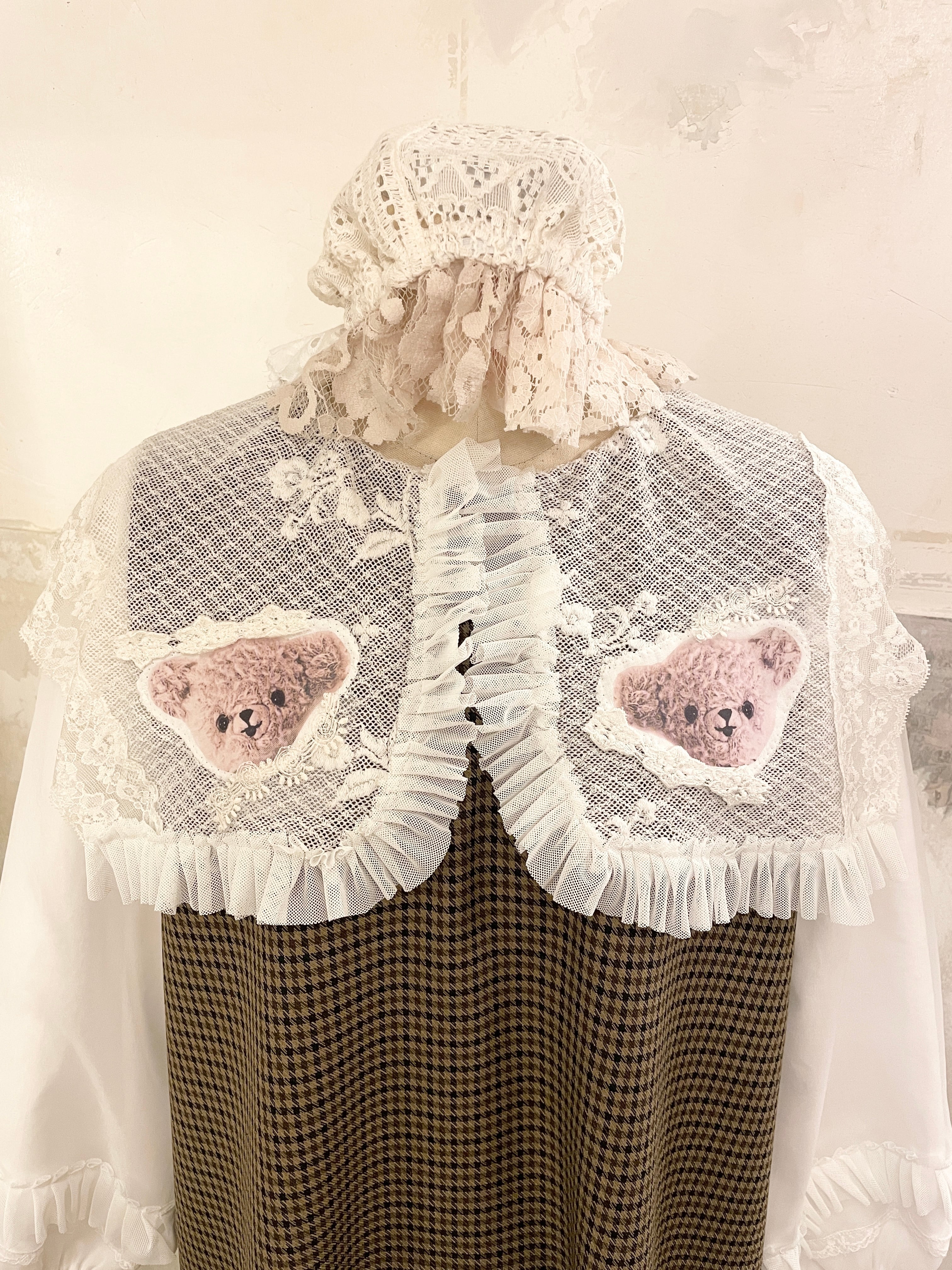 ブラウン系のチェック生地にレースたっぷりの大きな襟がついたデザイン。