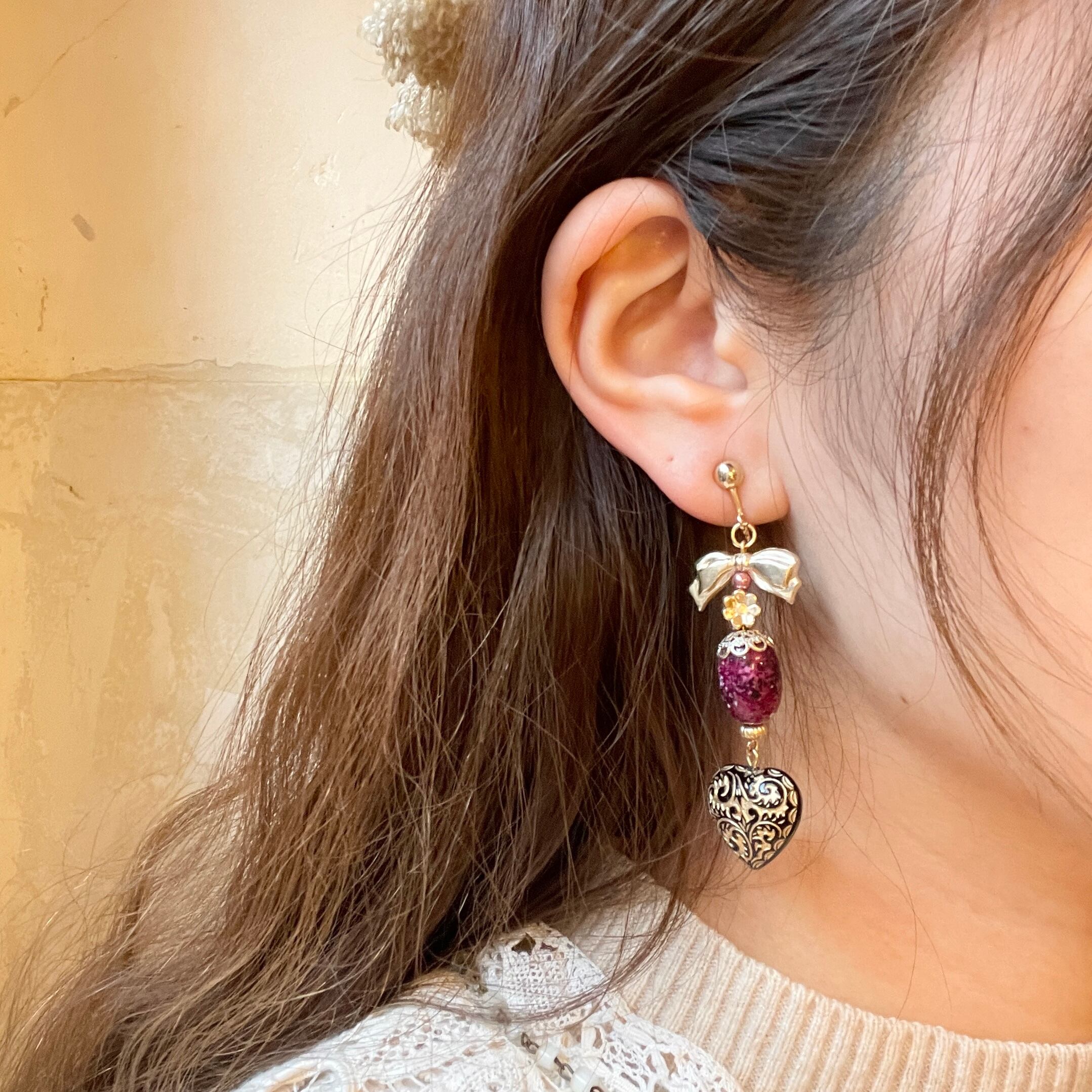 繊細で可愛いパーツを合わせたイヤリング。