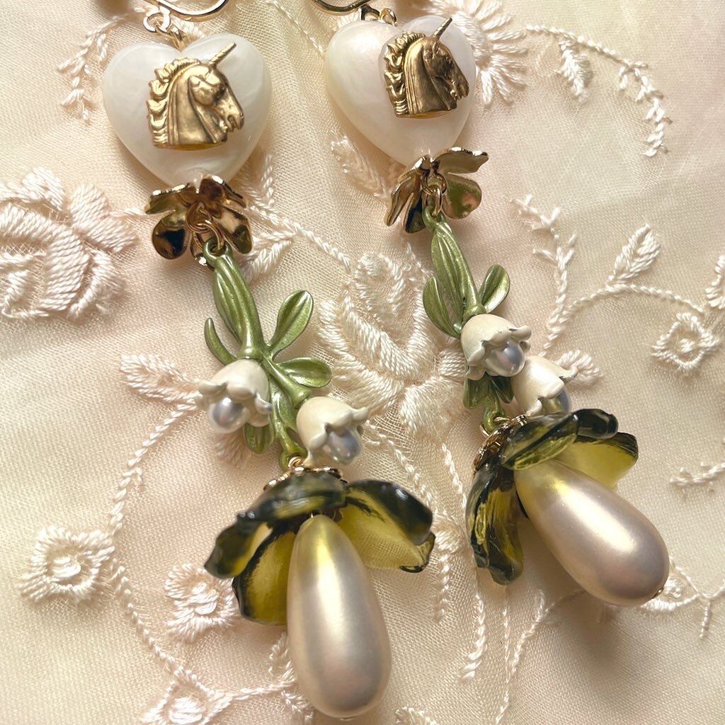 パールやすずらんみたいな繊細で可愛いパーツを合わせたイヤリング。