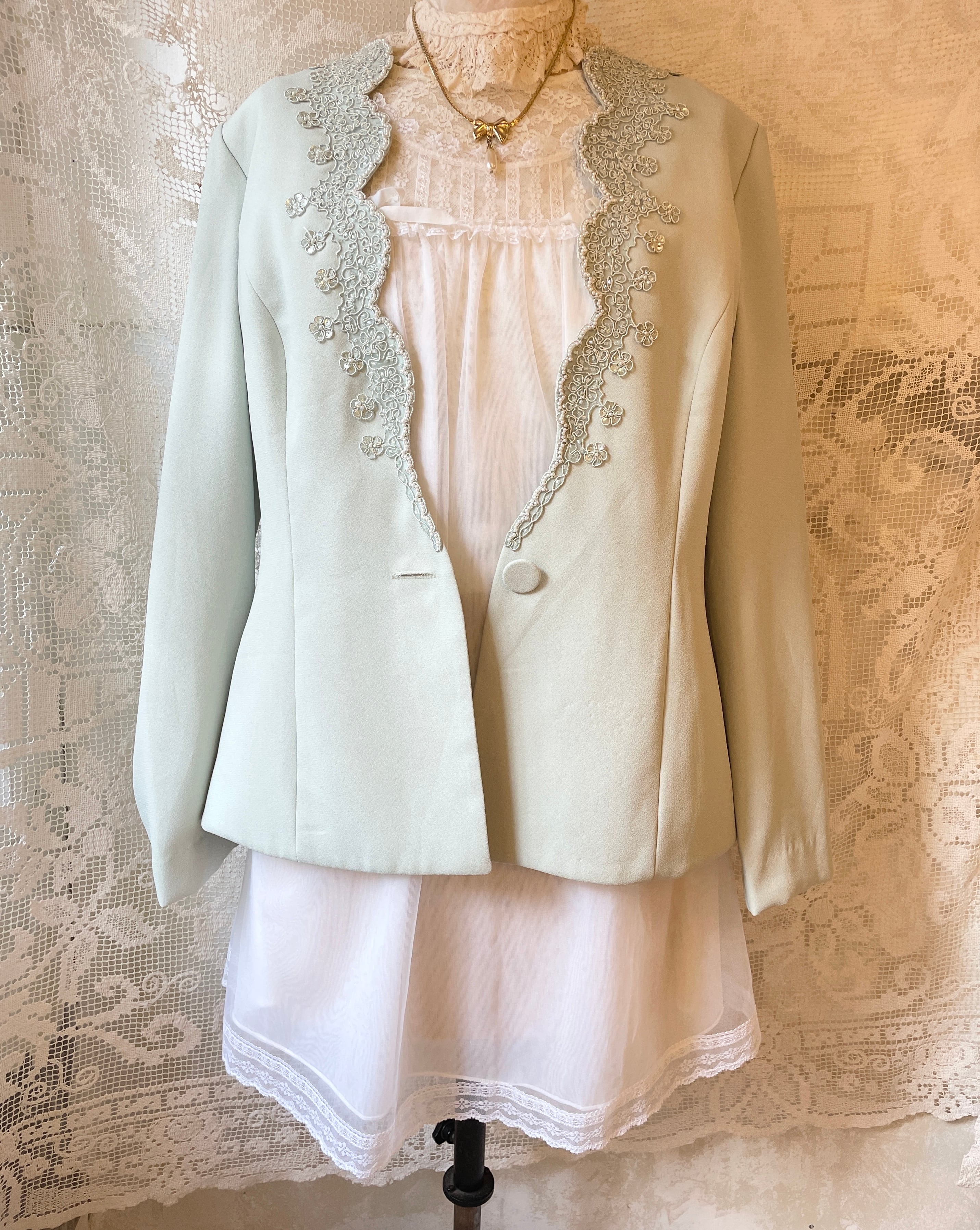 ミントカラーのビーズ刺繍が美しいジャケット。