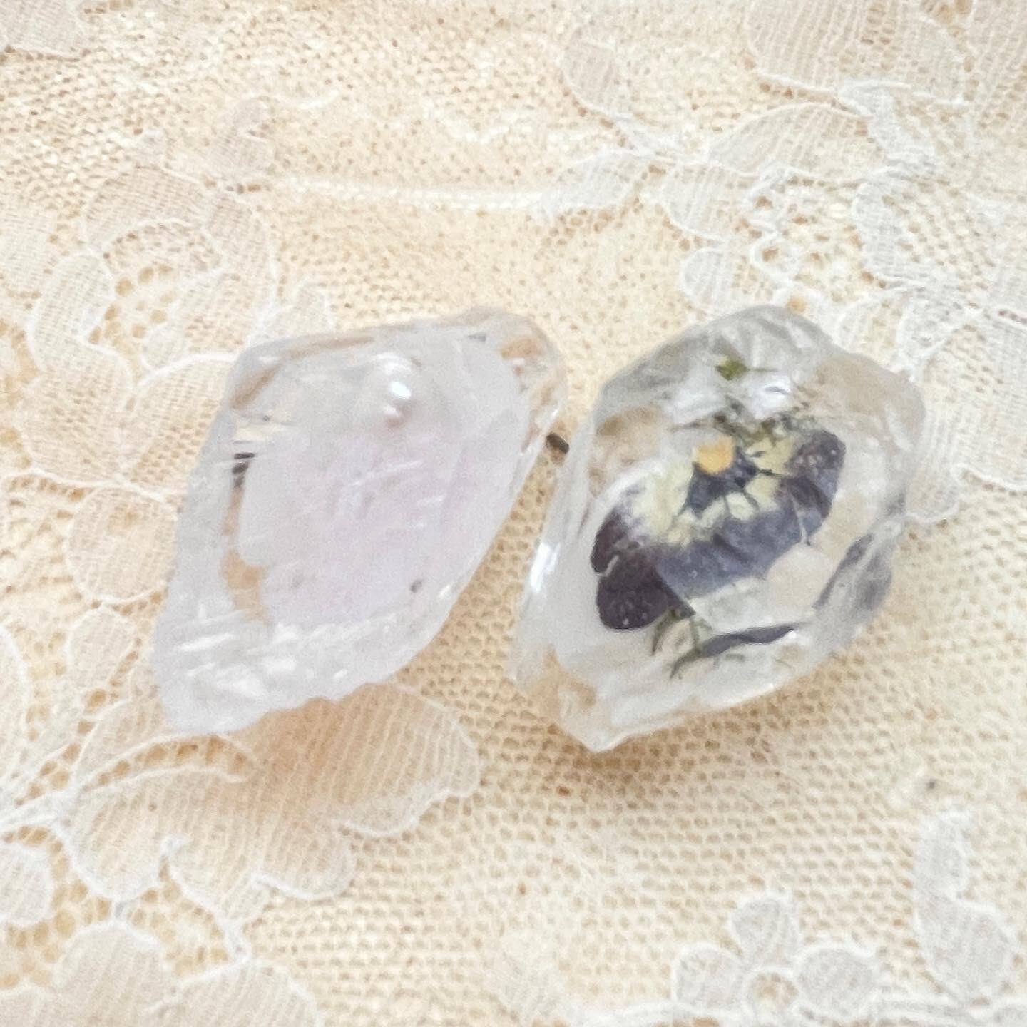 片耳はドライフラワー、片耳はパールを閉じ込めた鉱石みたいな繊細なデザインが可愛いピアスorイヤリング。