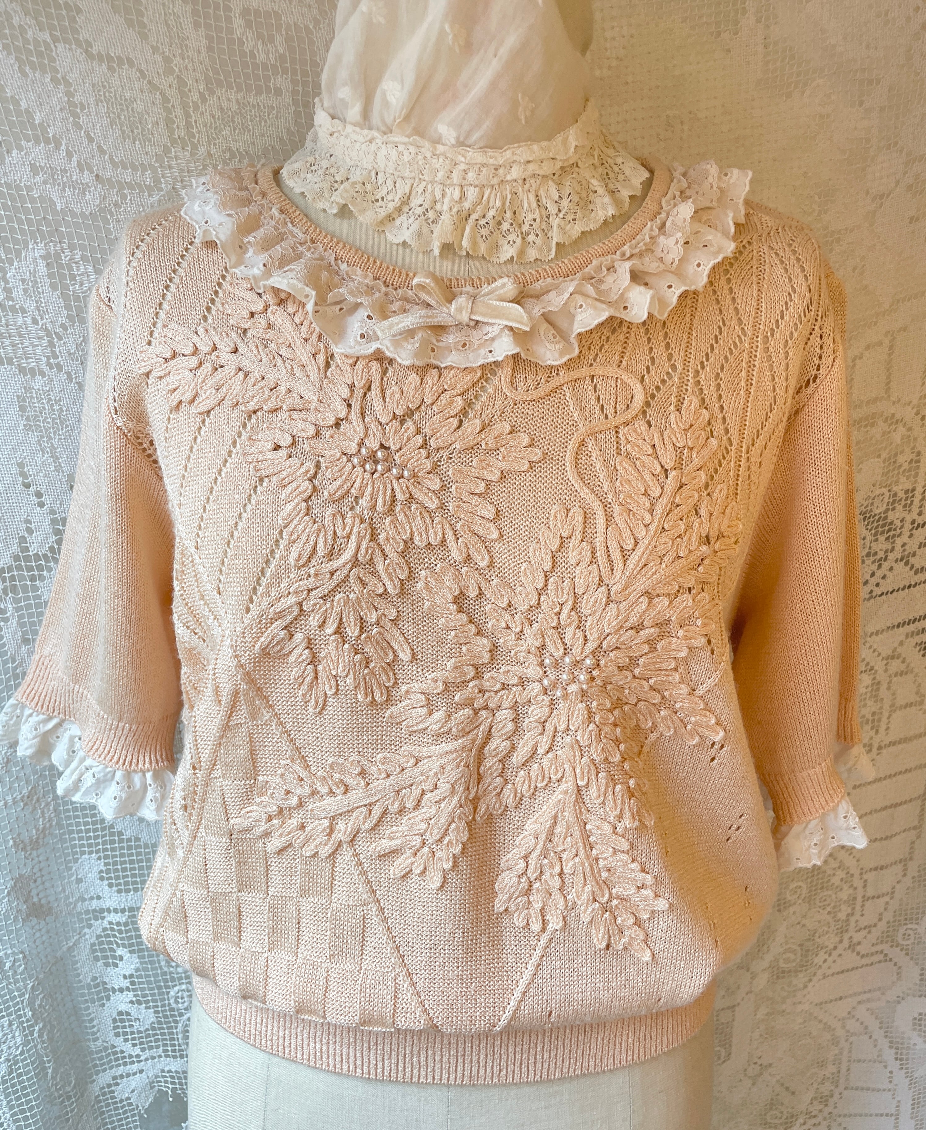 優しいペールオレンジにコットンレースの組み合わせが可愛いサマーニットカーディガン。