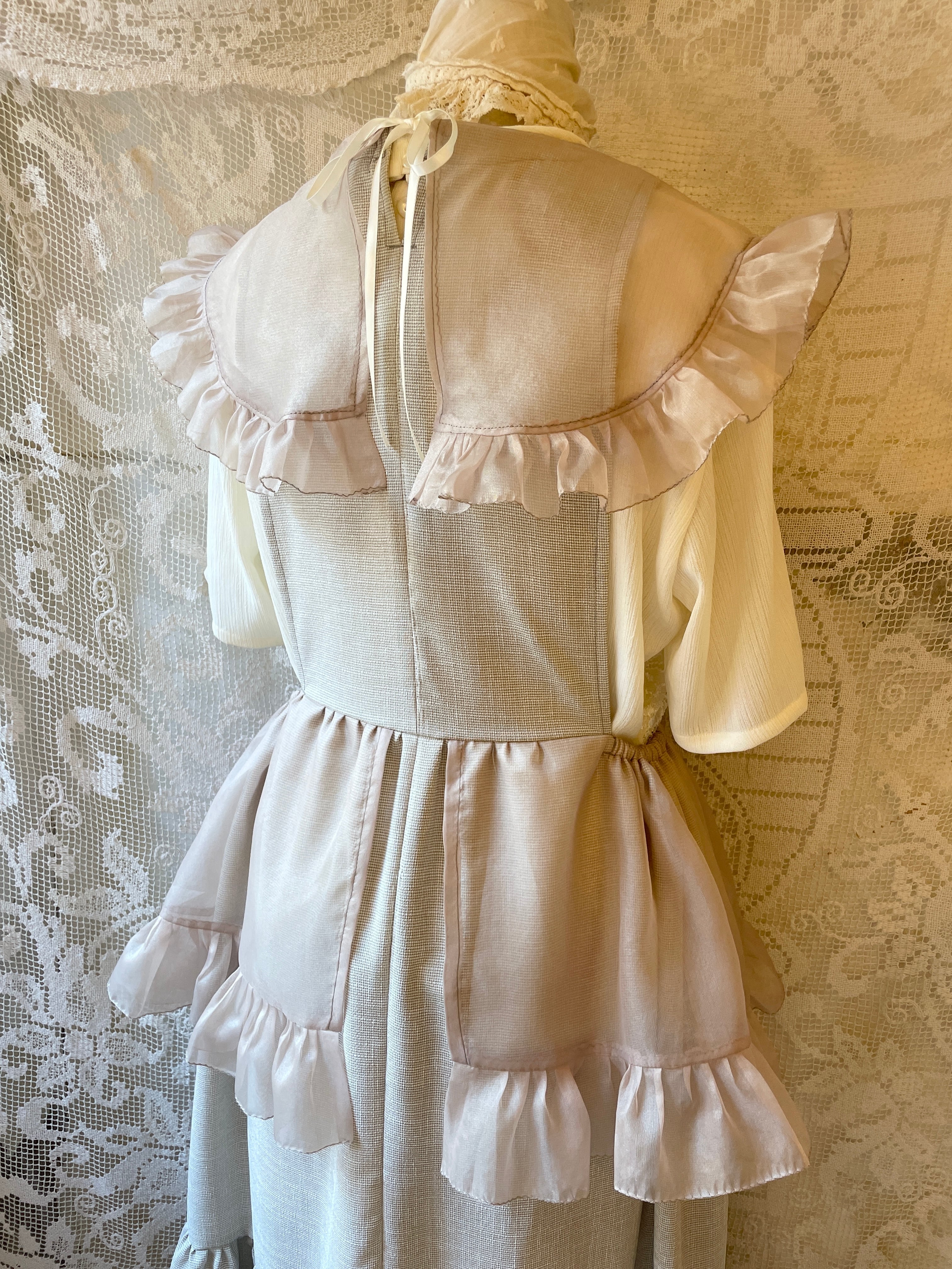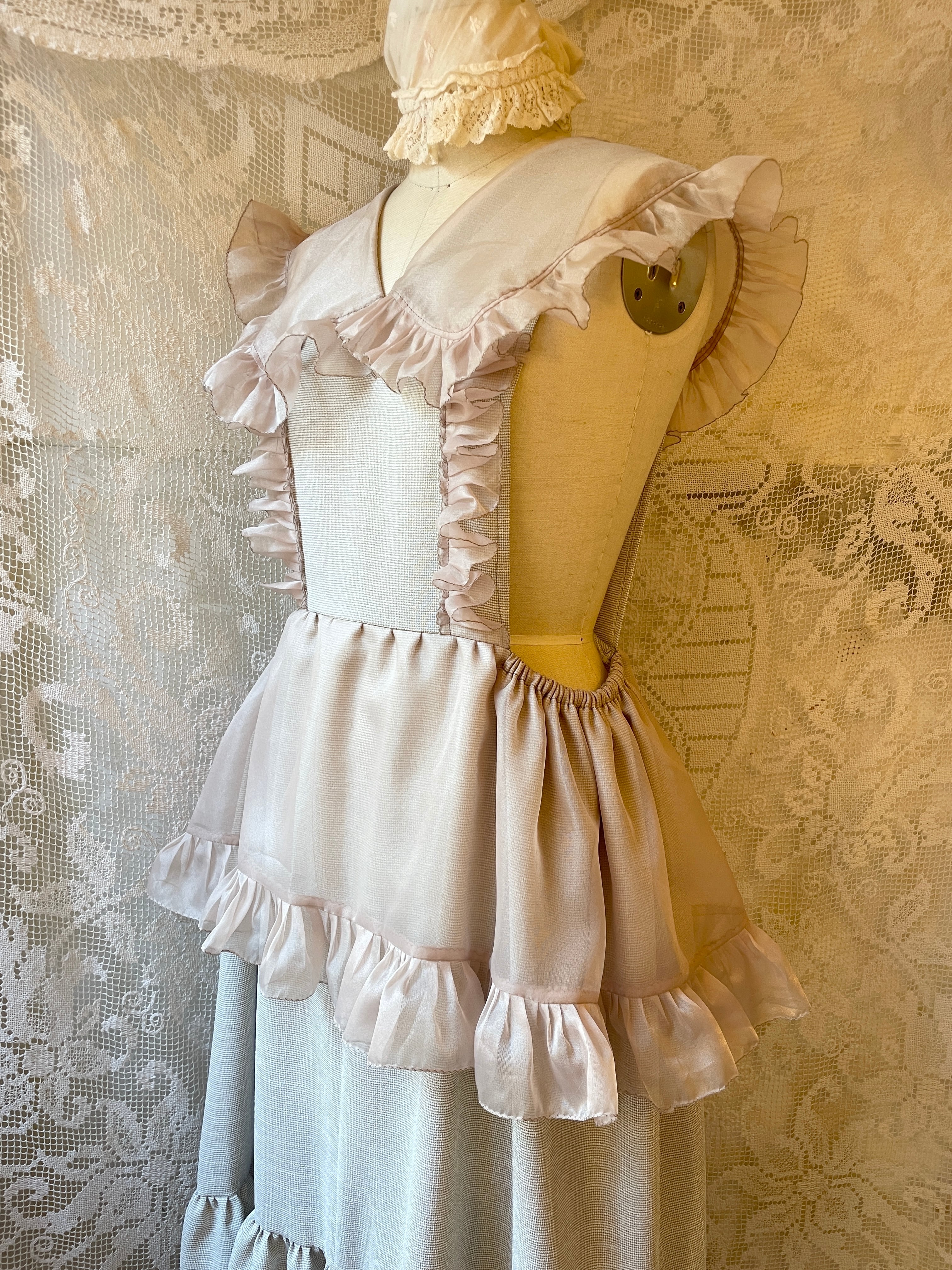 グレージュの細かいチェックの生地にピンクベージュのシアーな大きな襟やエプロンのような装飾が可愛いです。