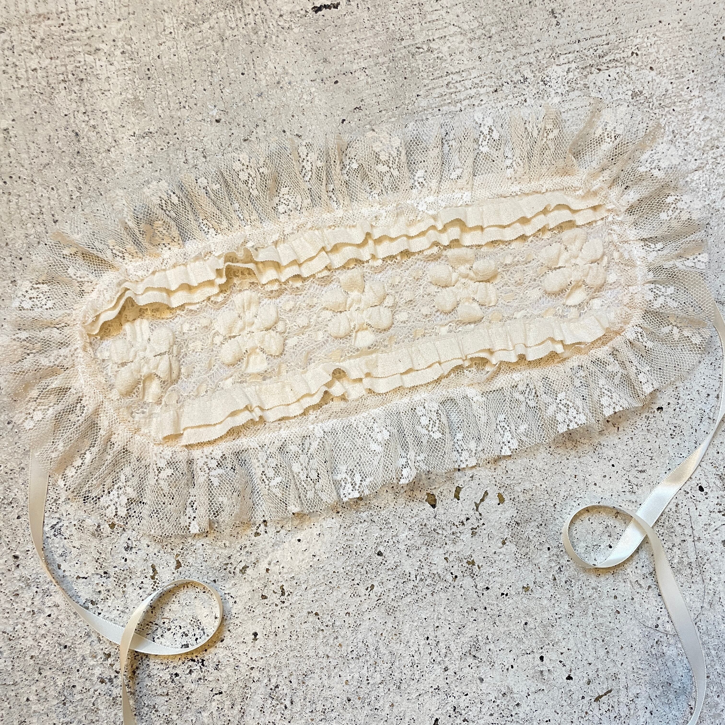 両サイドからレースのリボンが出ていて顎の下か頭の後ろで結ぶ仕様です。