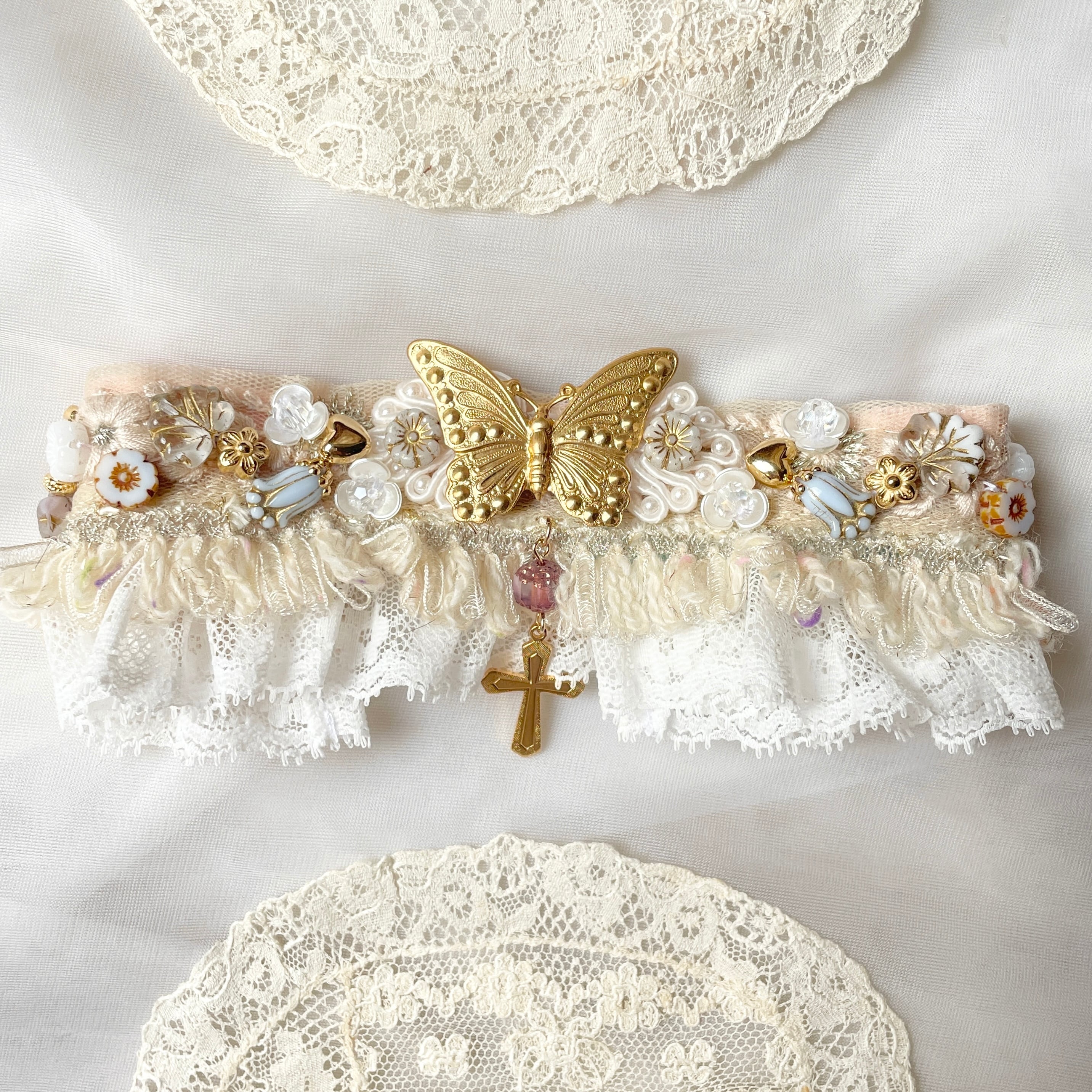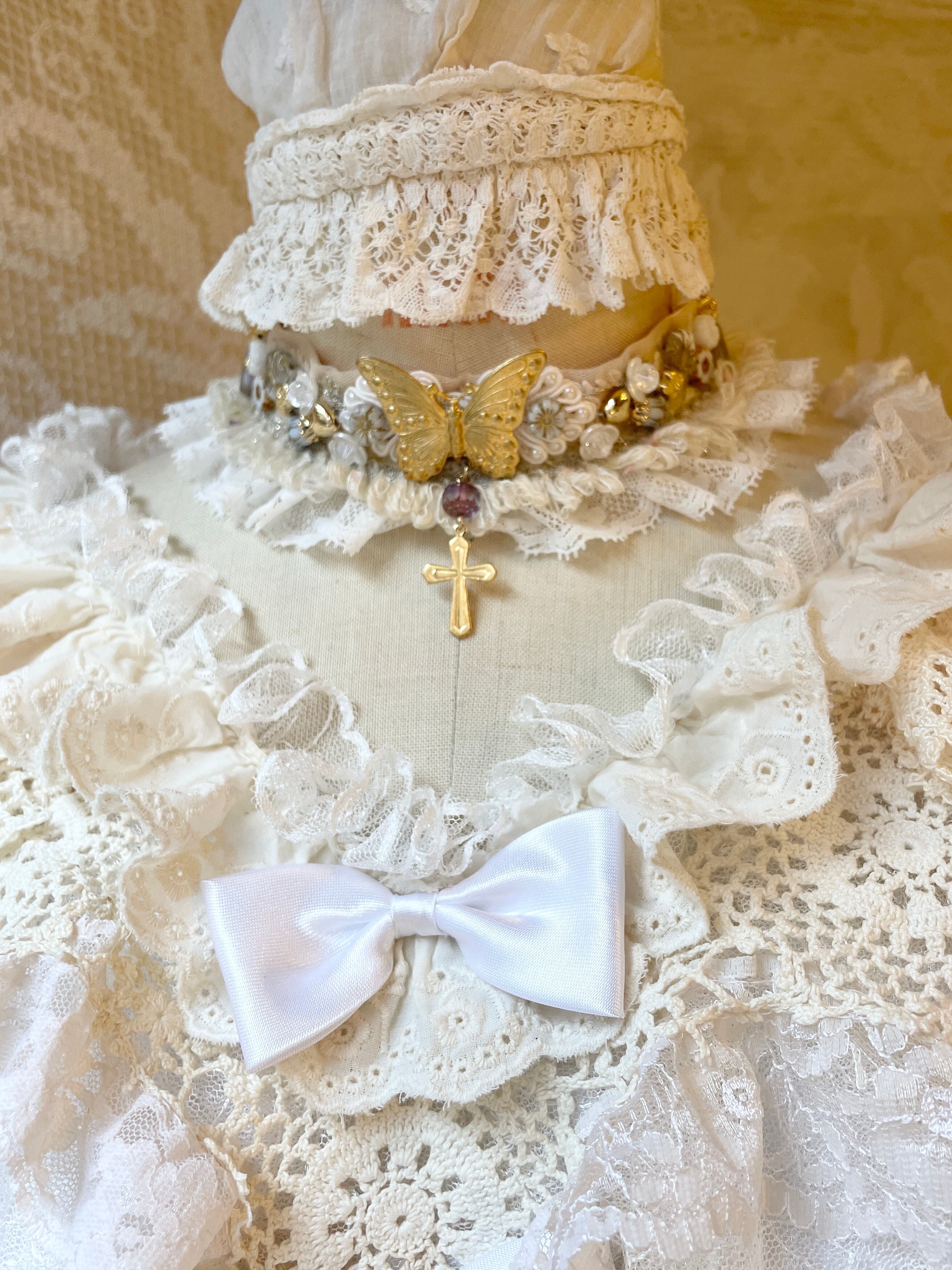 ロマンティックなパーツを組み合わせた甘いデザインが美しい布タイプのチョーカー。