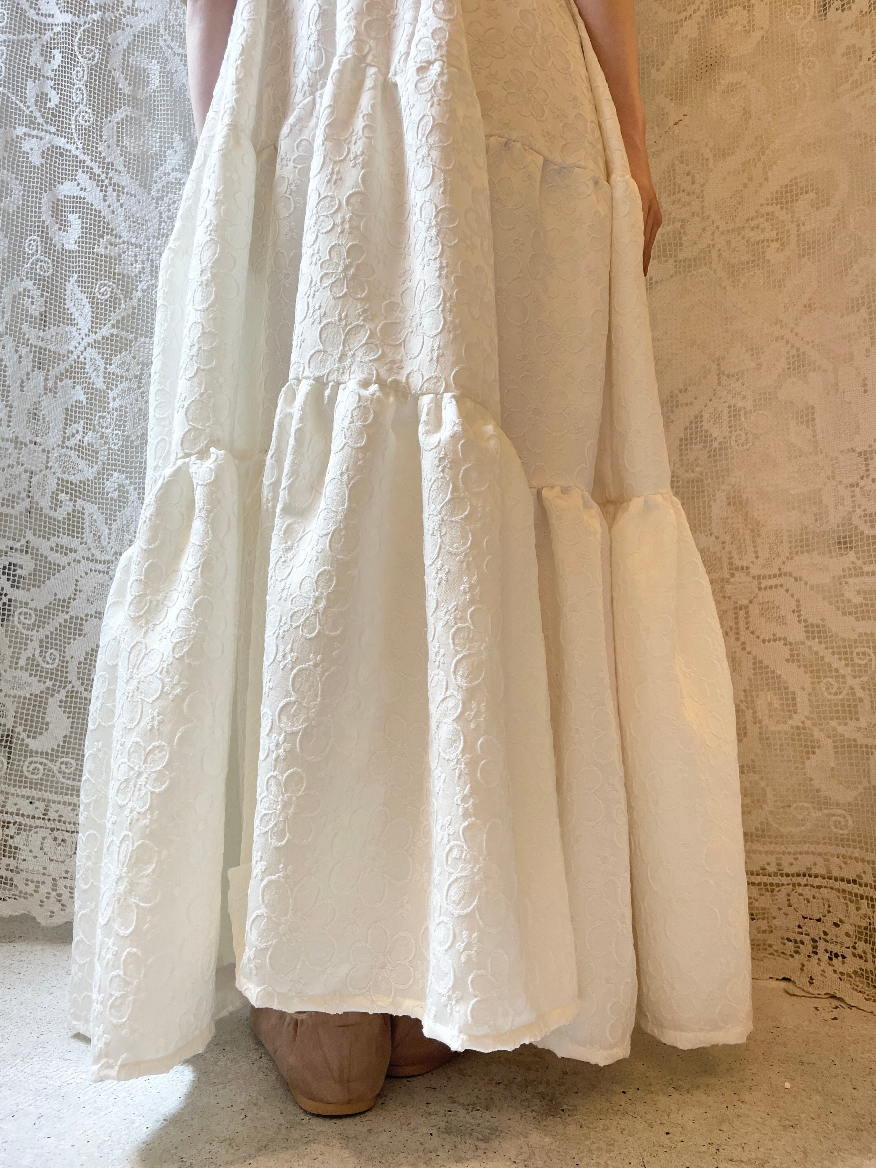 さりげないお花の模様が可愛いオフホワイトのジャガード生地をたっぷり使用して制作しています。