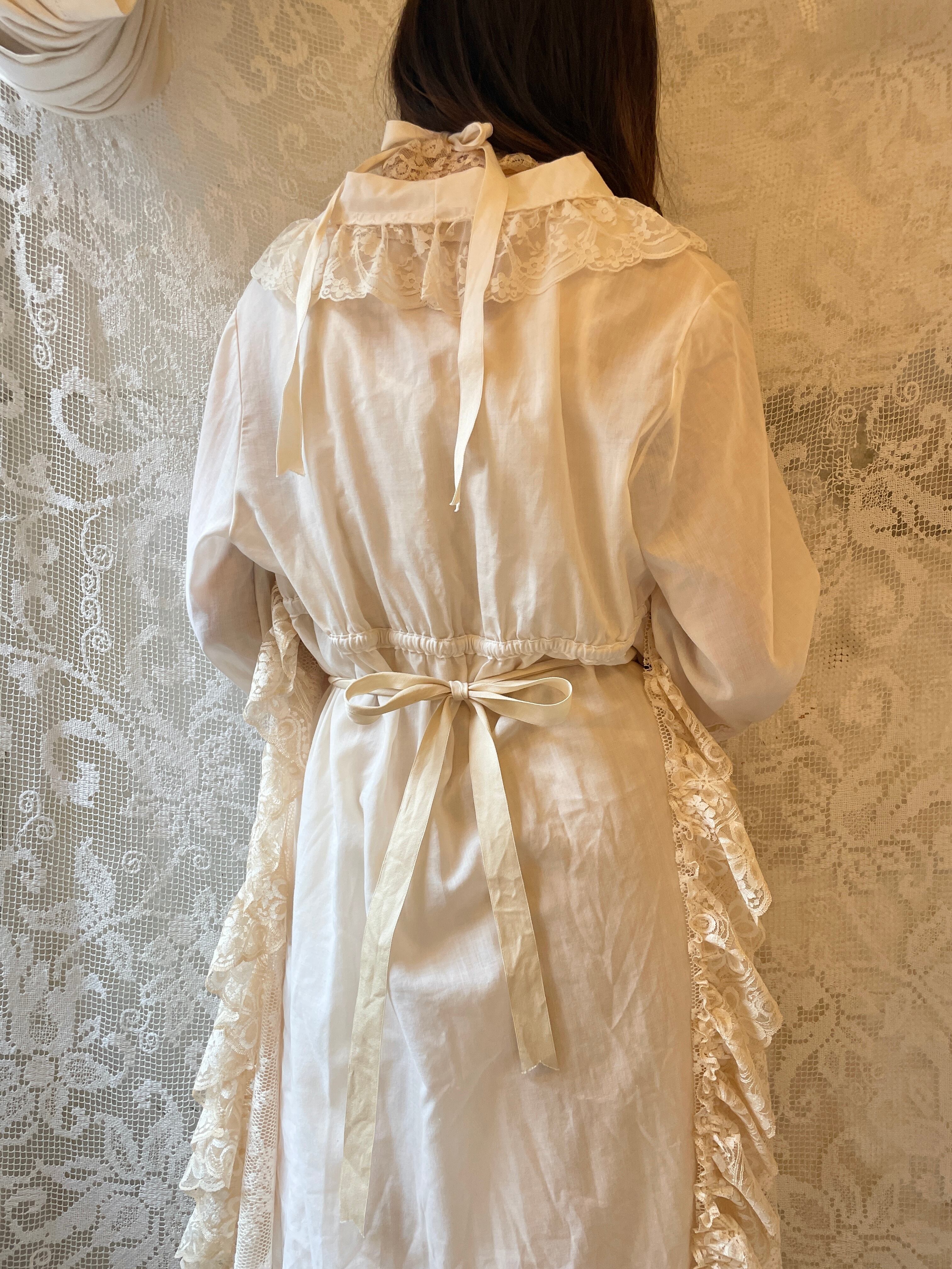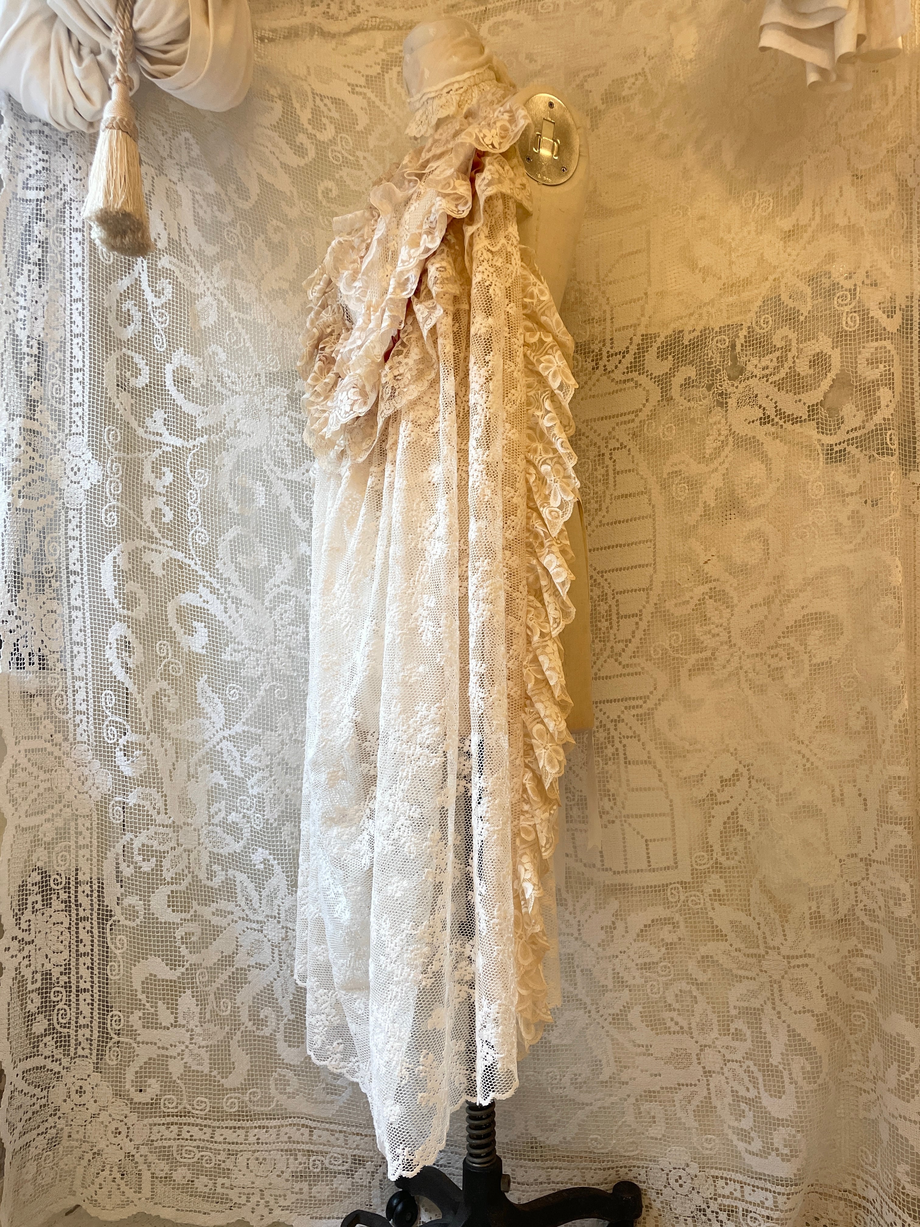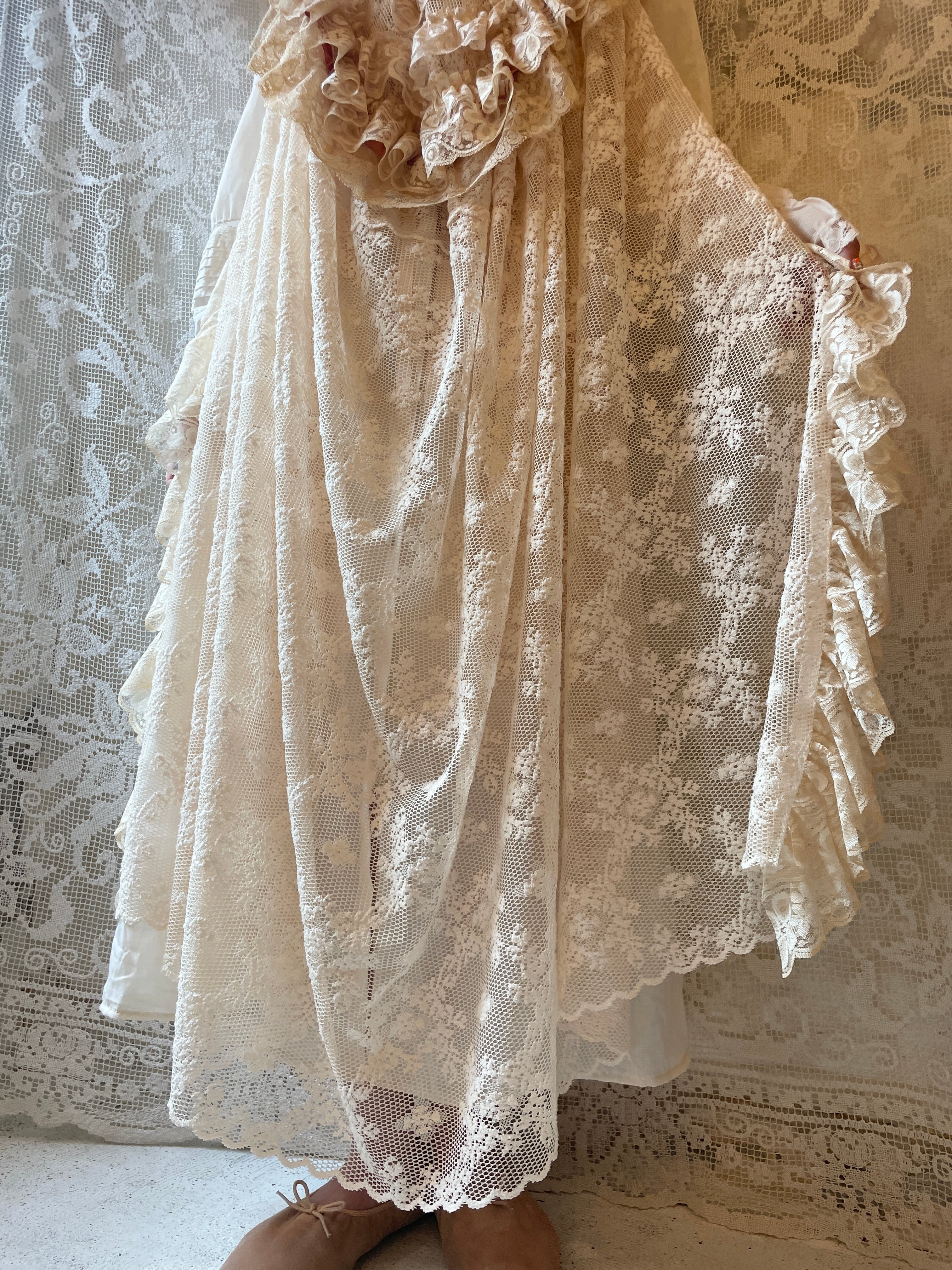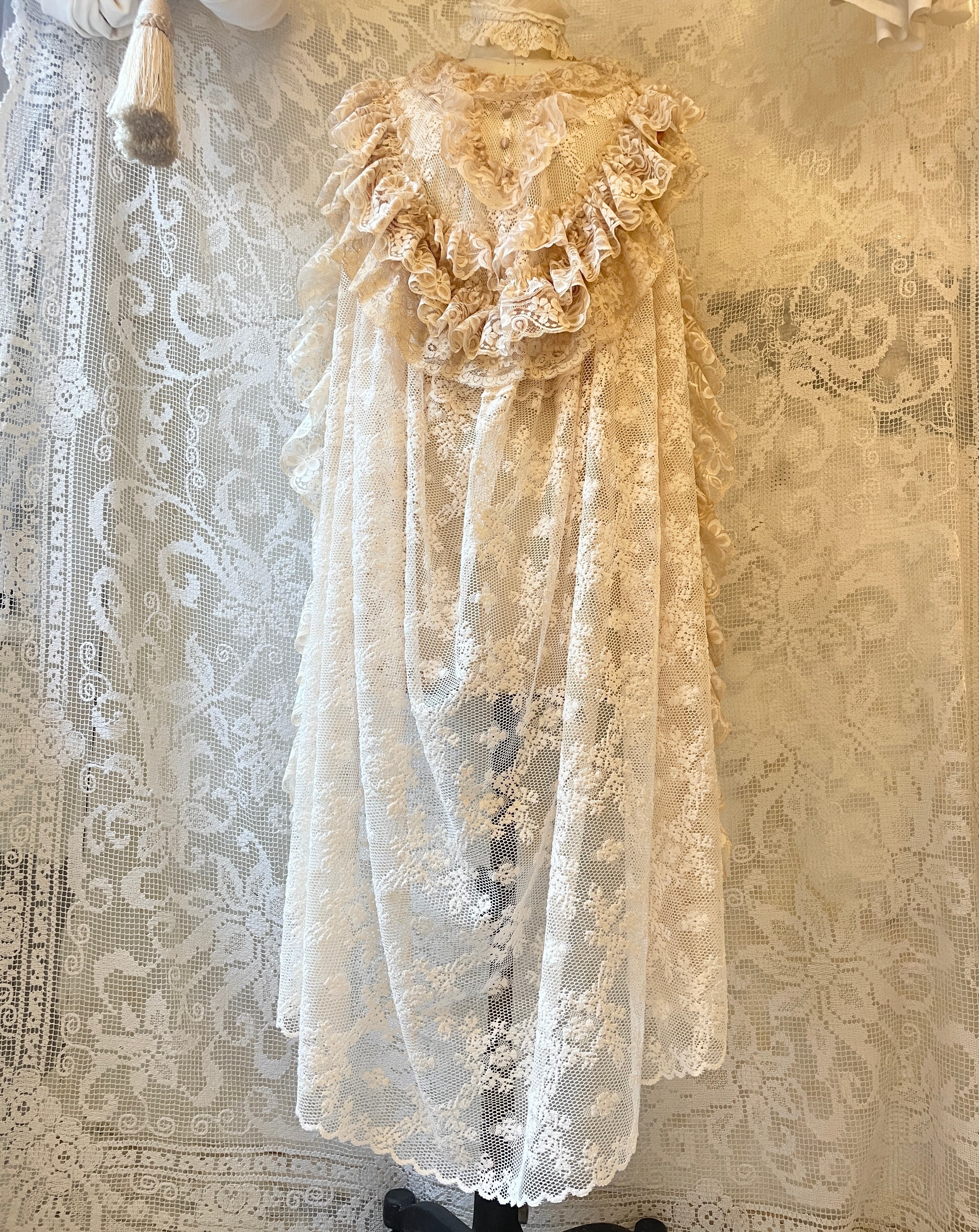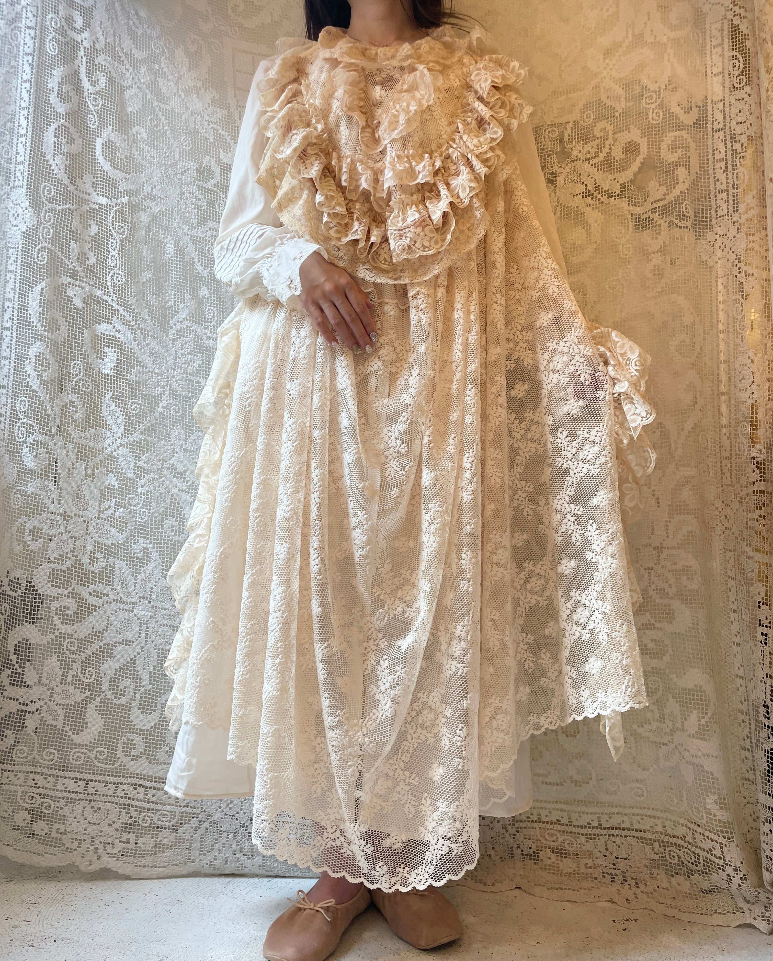 紅茶染めのような温かみのあるベージュレース生地をたっぷり使用して制作しています。