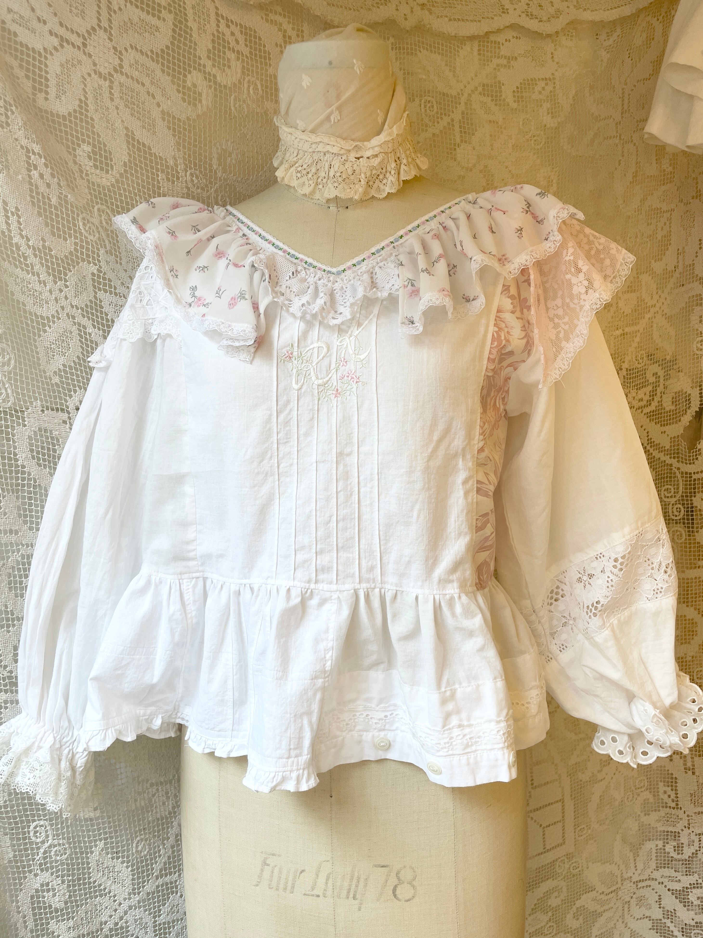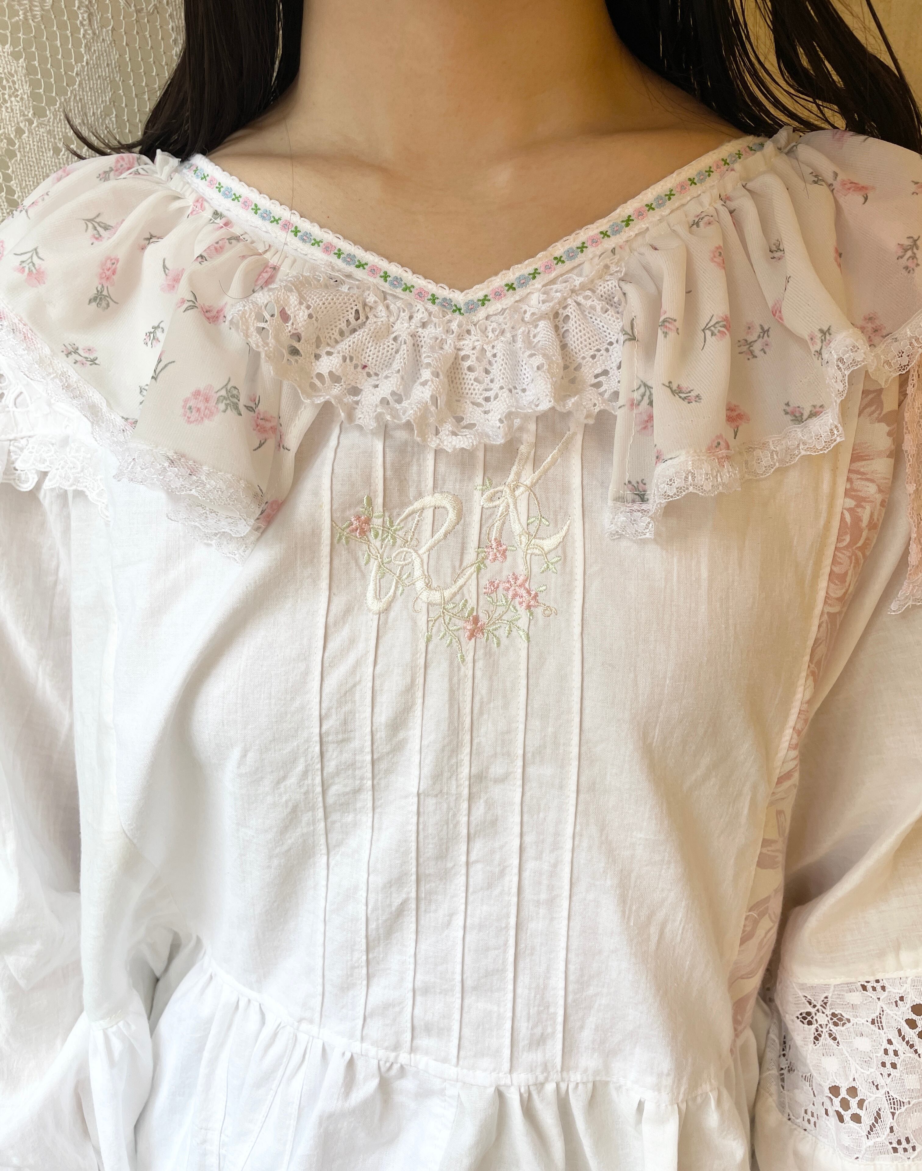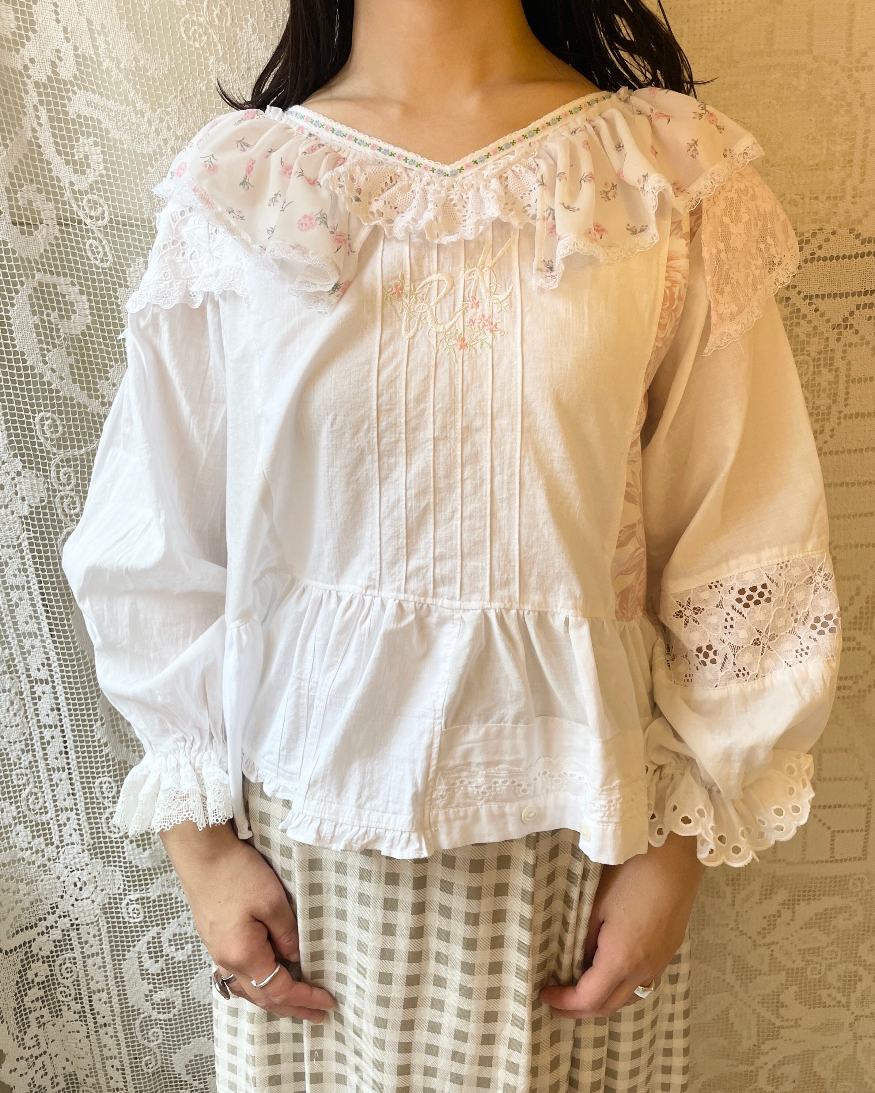 ホワイト、ピンク系のいろんな古着や素材を使用したブラウス