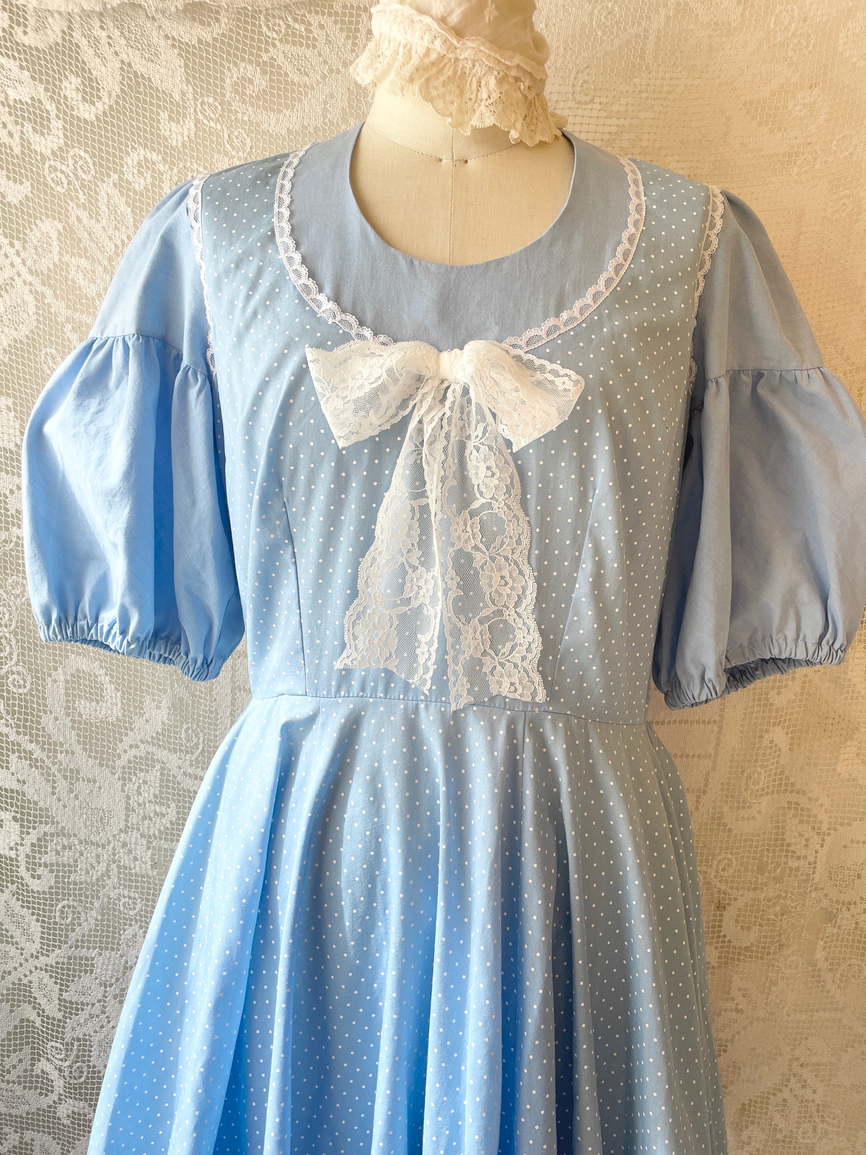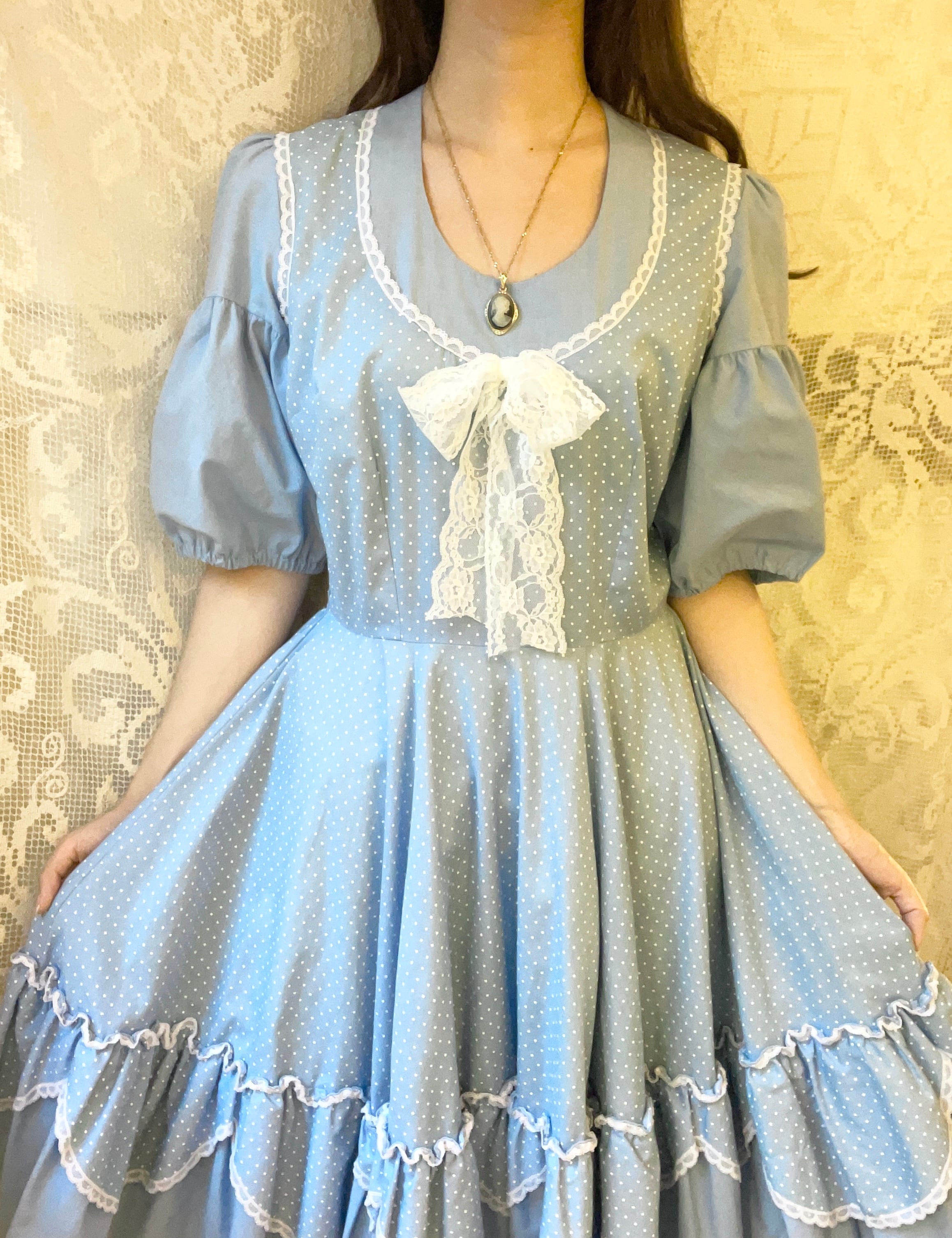 アリスのような水色ドットの生地をたくさん使用したボリュームたっぷりなワンピース。