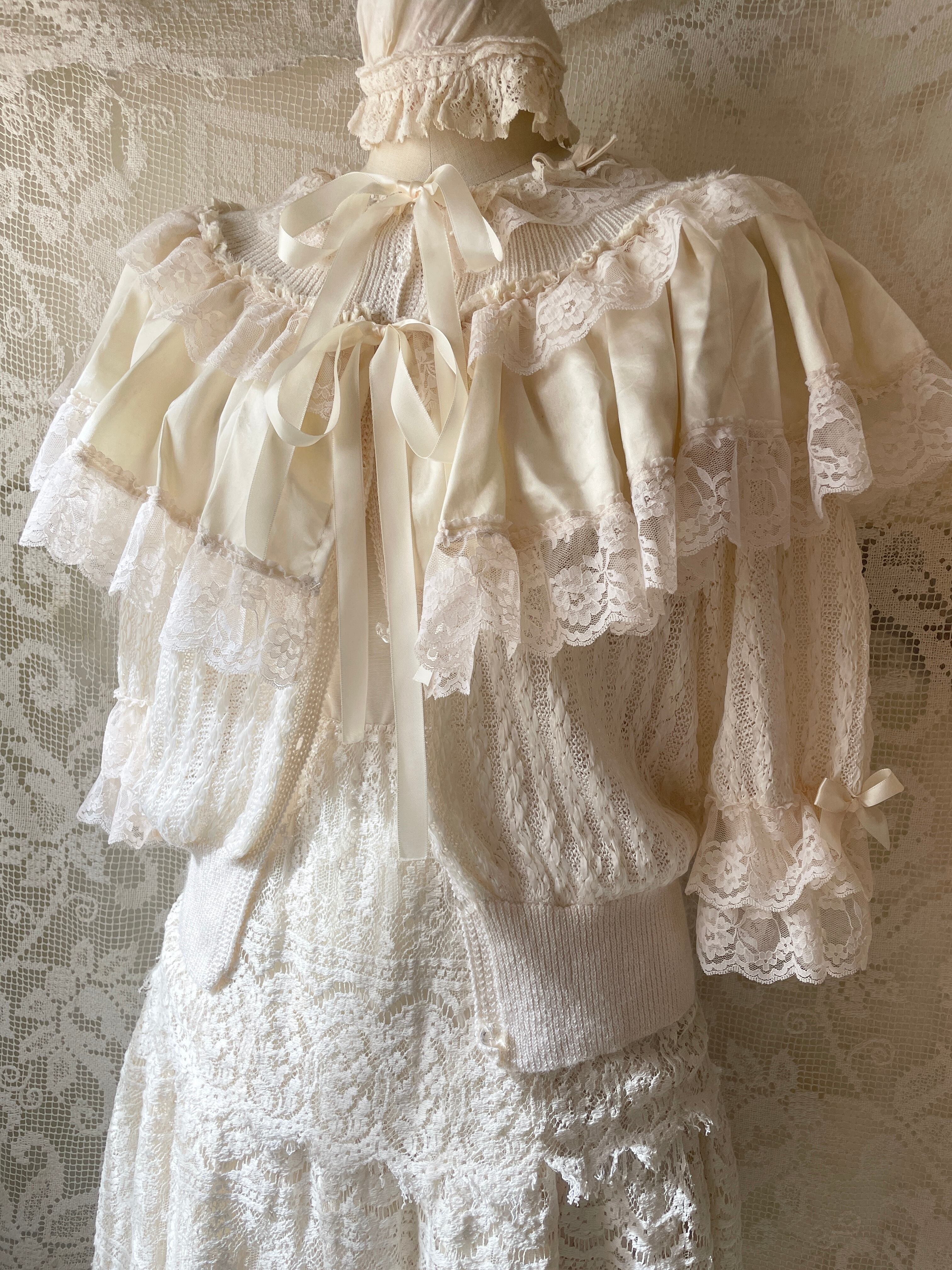 全体に生成色のリボンを編み込んだusedニットにvintageドレスの生地やレース等いろいろな素材で装飾使しました。