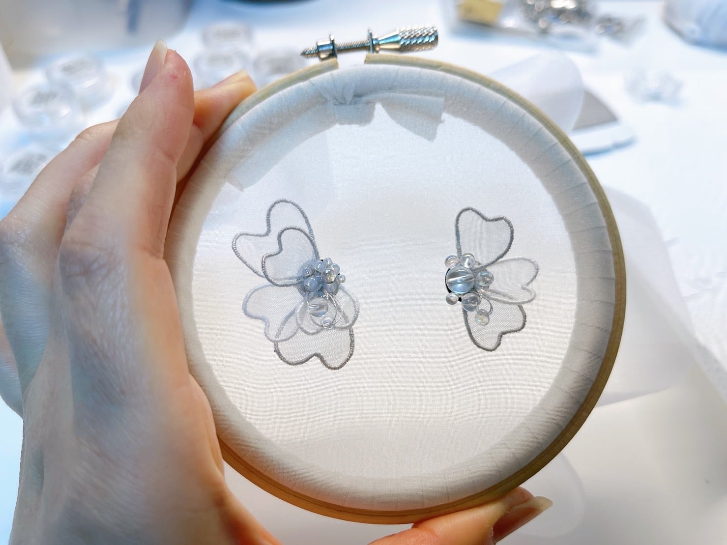 オーガンジーやレース生地に刺繍の縁取りをして一枚ずつ花びらを制作した繊細なデザインのアクセサリー。