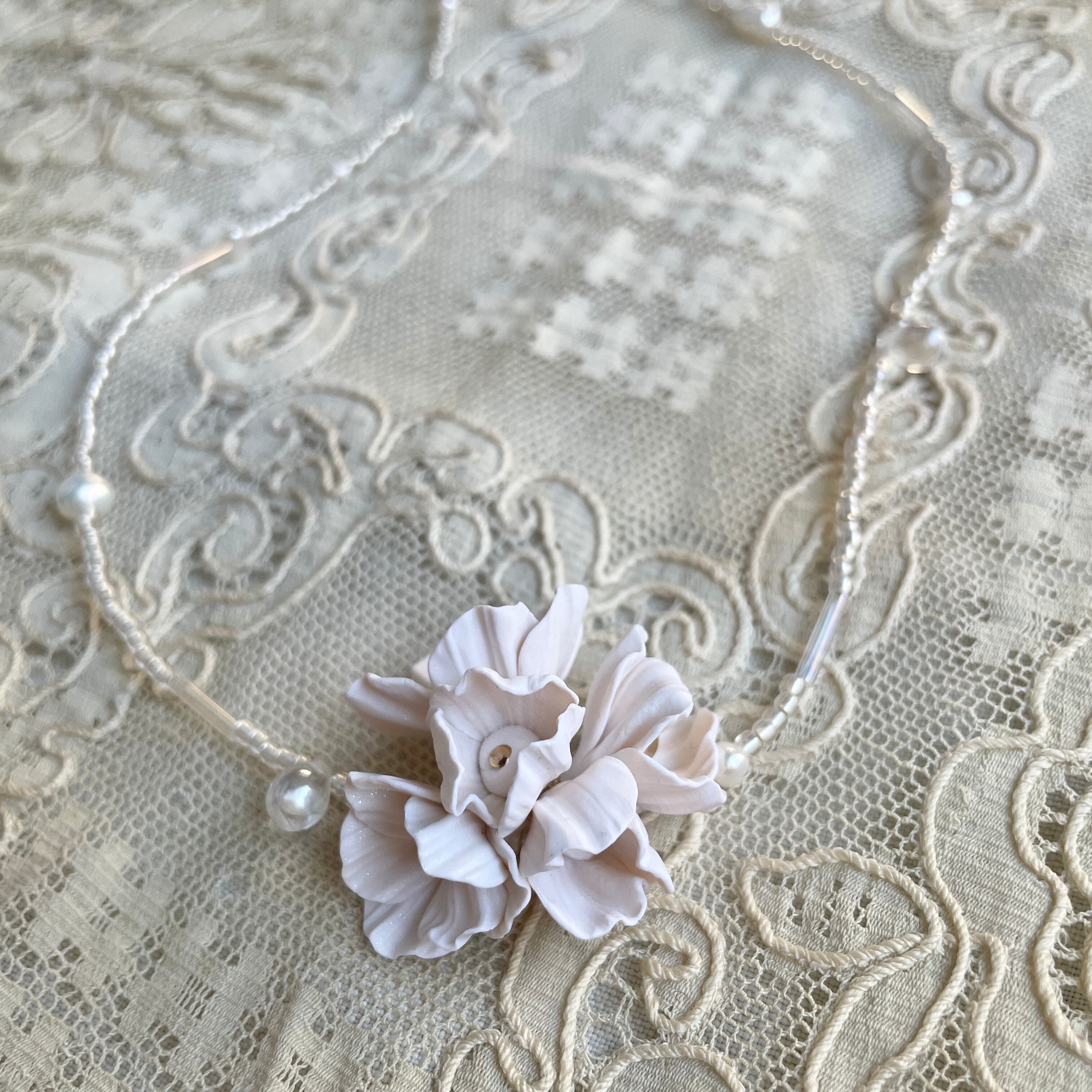 花びら一枚一枚のパーツからハンドメイドで制作した繊細なデザインのビーズネックレス。