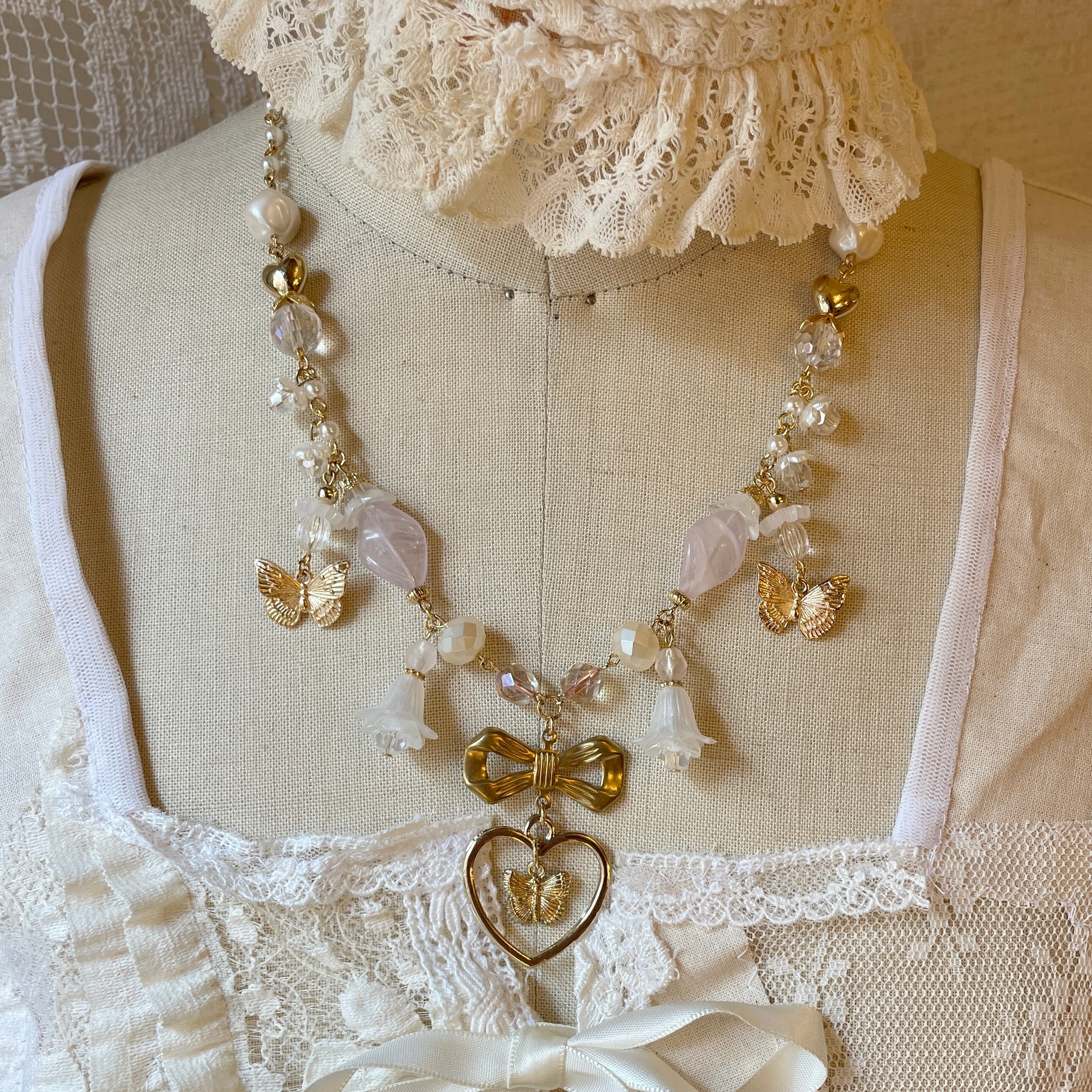 リボンやハート、バタフライ等ロマンティックなパーツを組み合わせた甘いデザインが美しいネックレス。アンティークのお洋服とも相性ばっちりです。