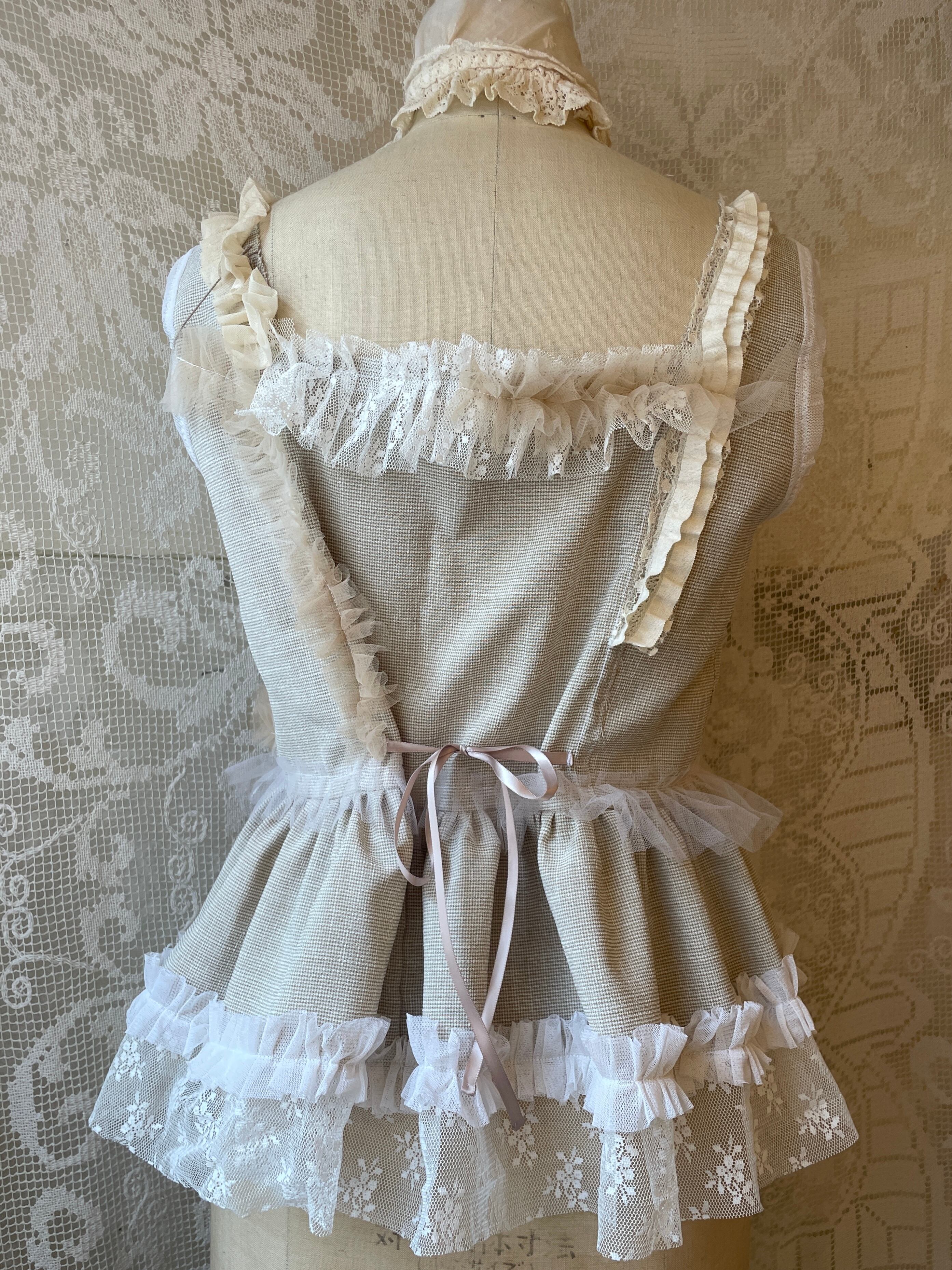 フロントリボンの結び具合で身幅、ウエストを調整できるのでブラウスやTシャツ、ワンピース等、一年中いろんなお洋服に重ねて着用できます。