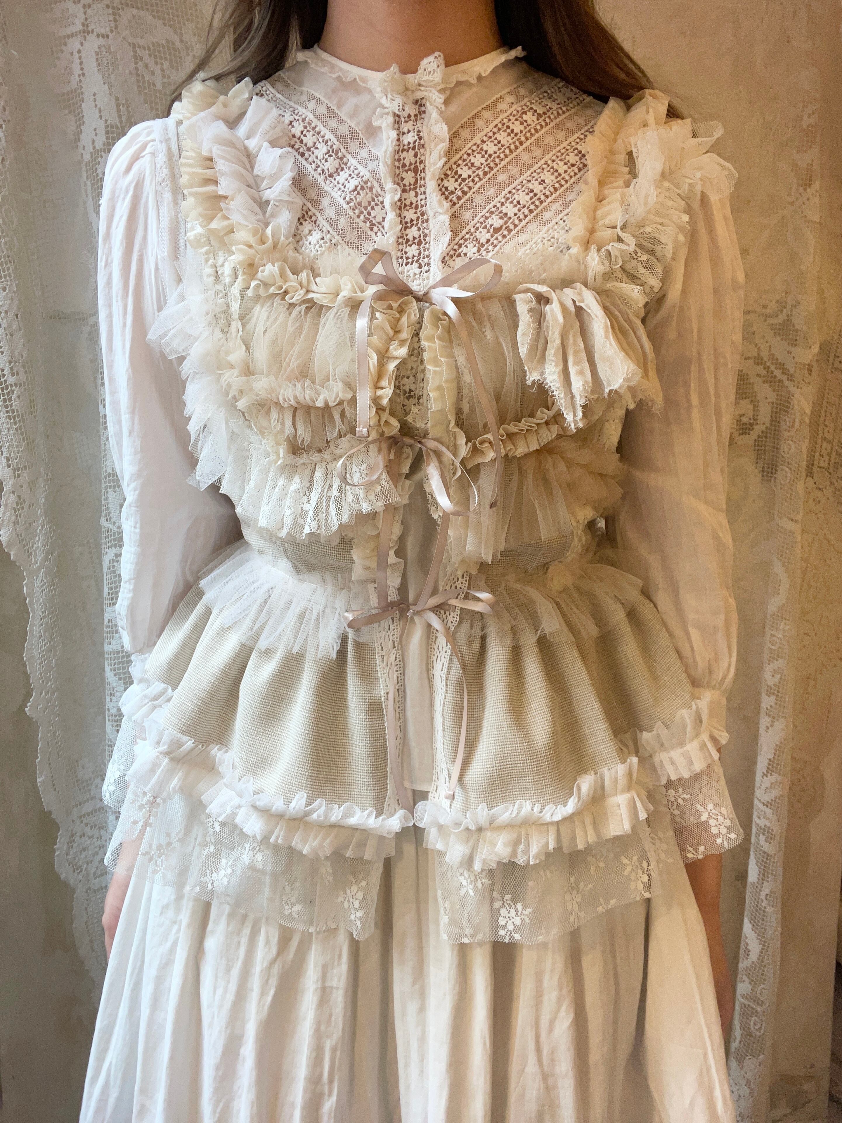 細かいベージュのチェック生地にたくさんのチュールが豪華に装飾されていてとても綺麗です。