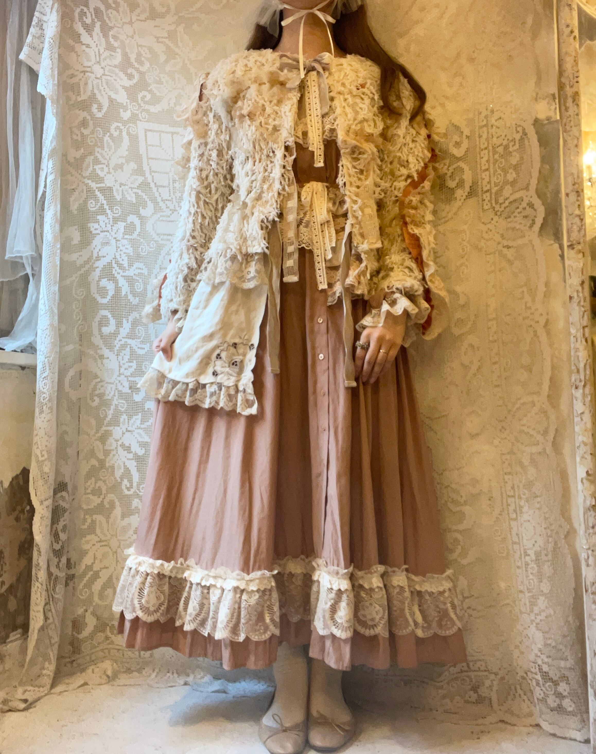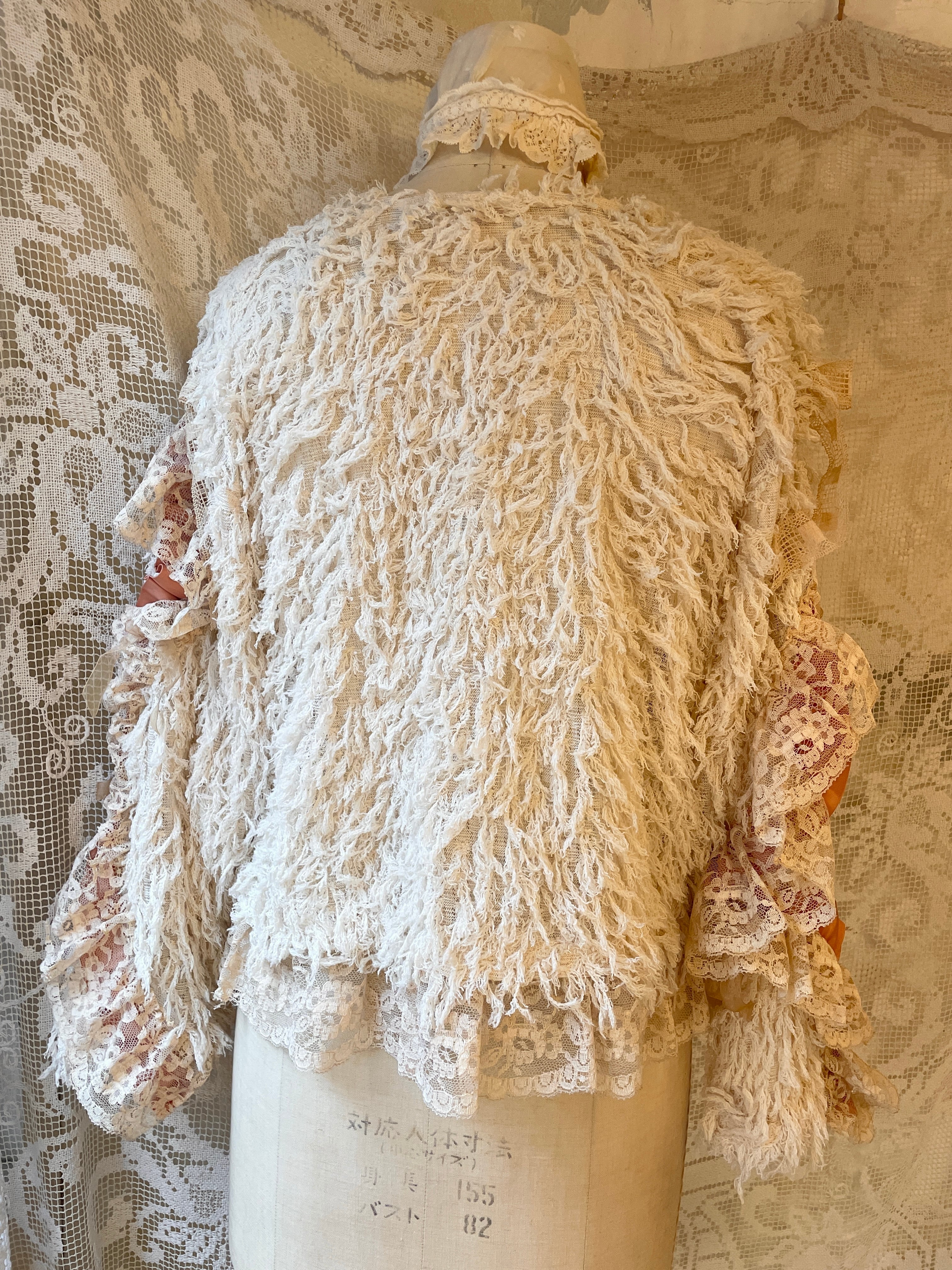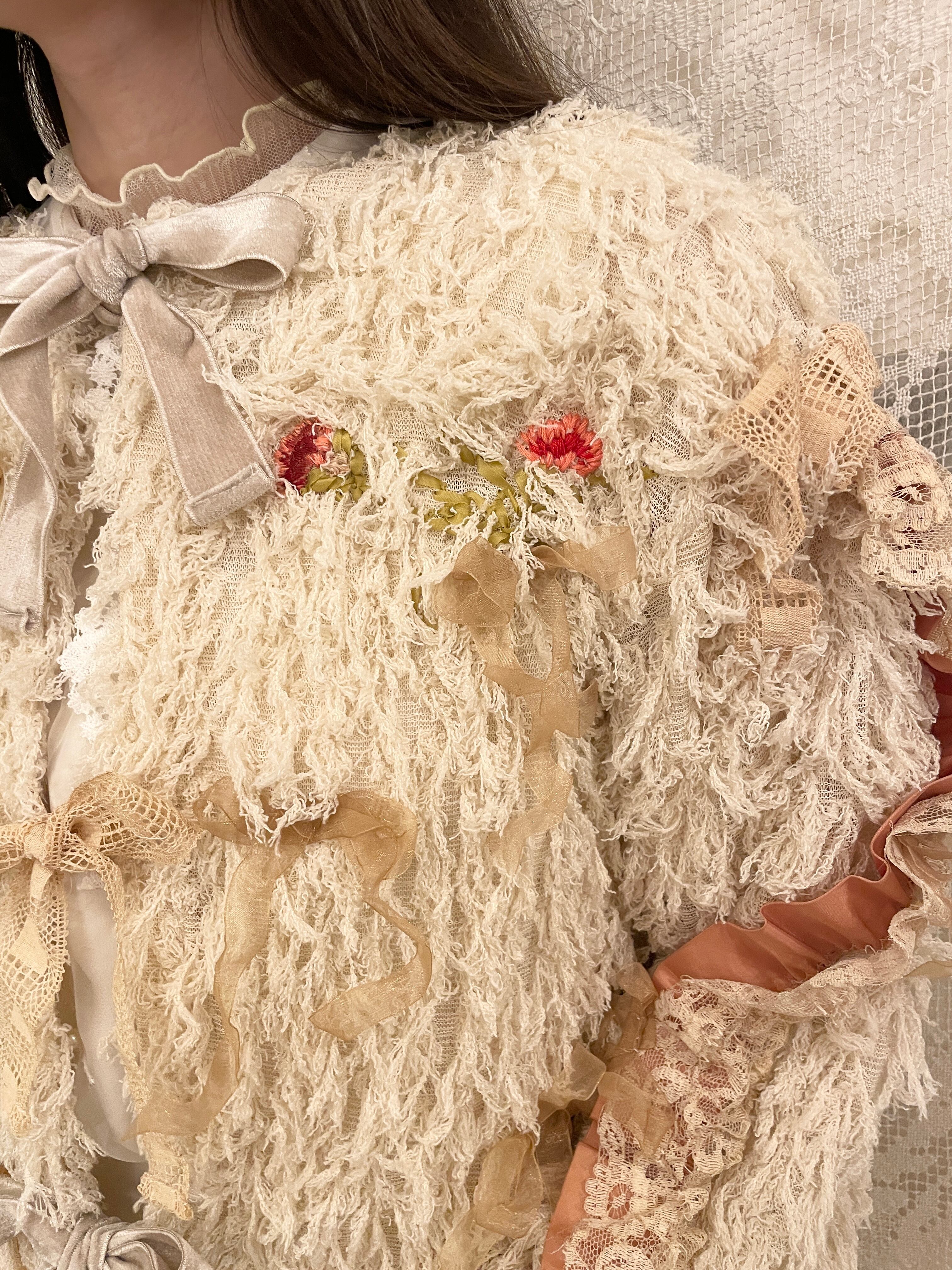 柔らかい毛足の長いカーディガンにvintageのレースやリボンをたっぷり装飾したデザインが可愛いです。
