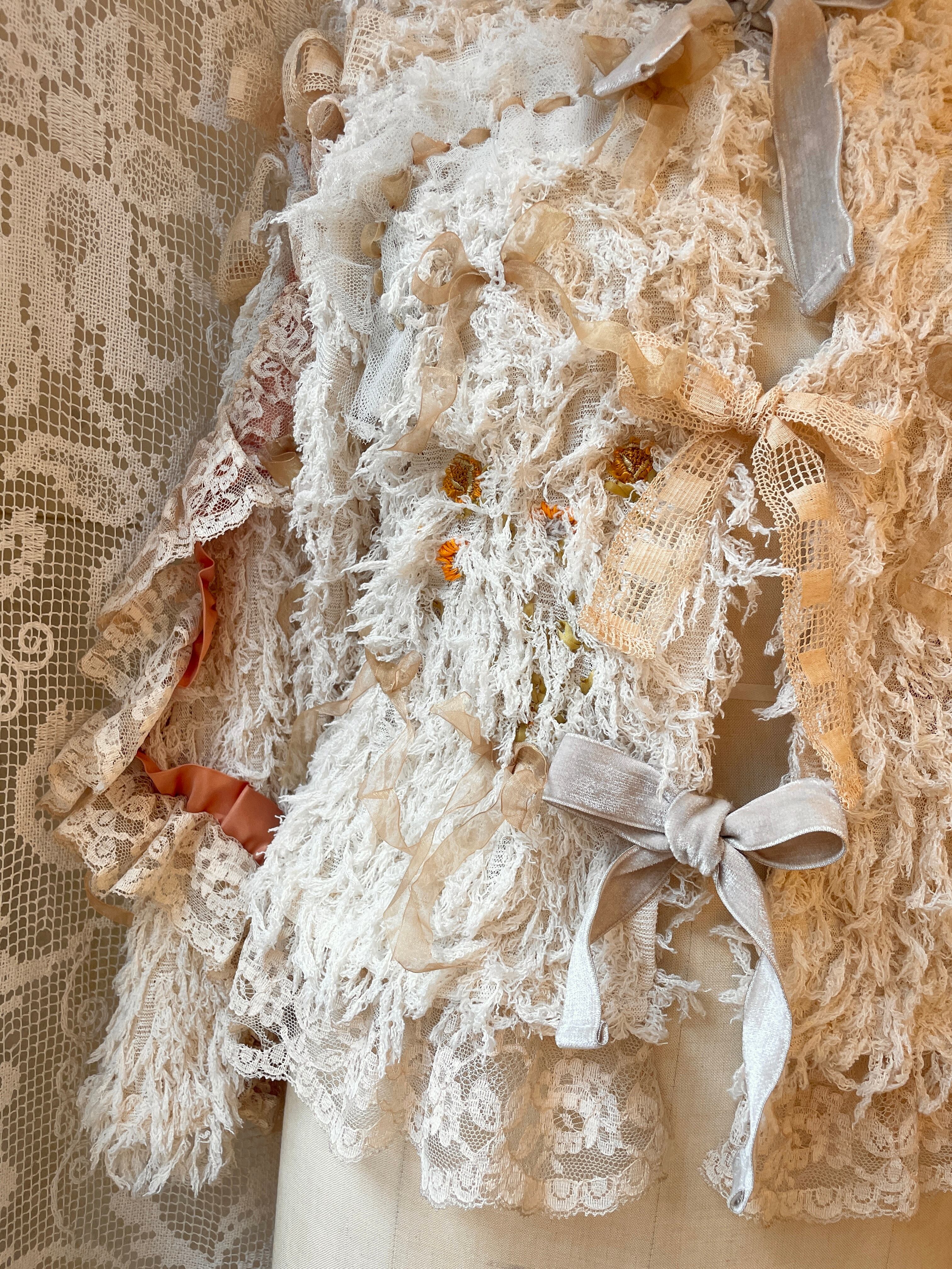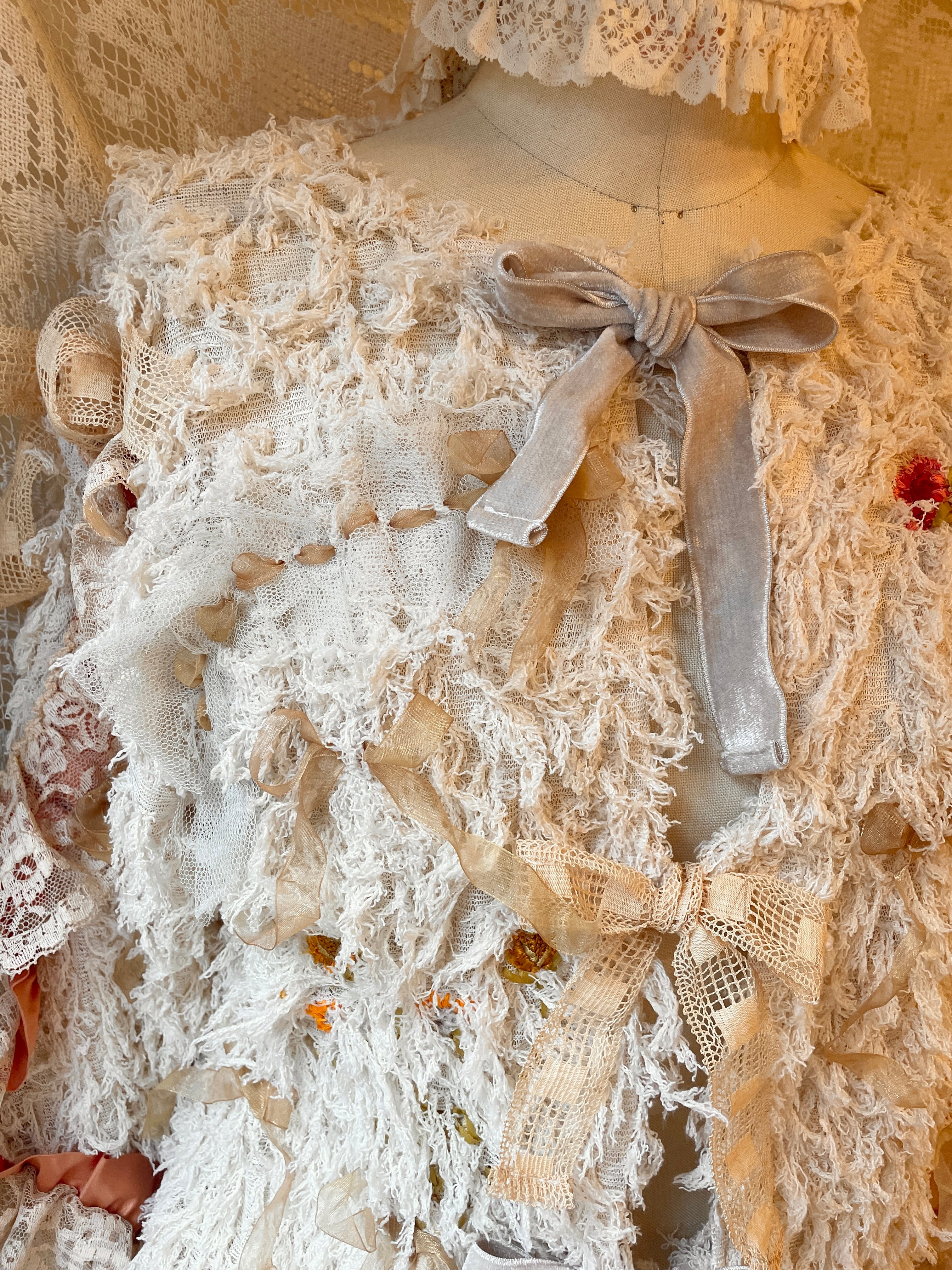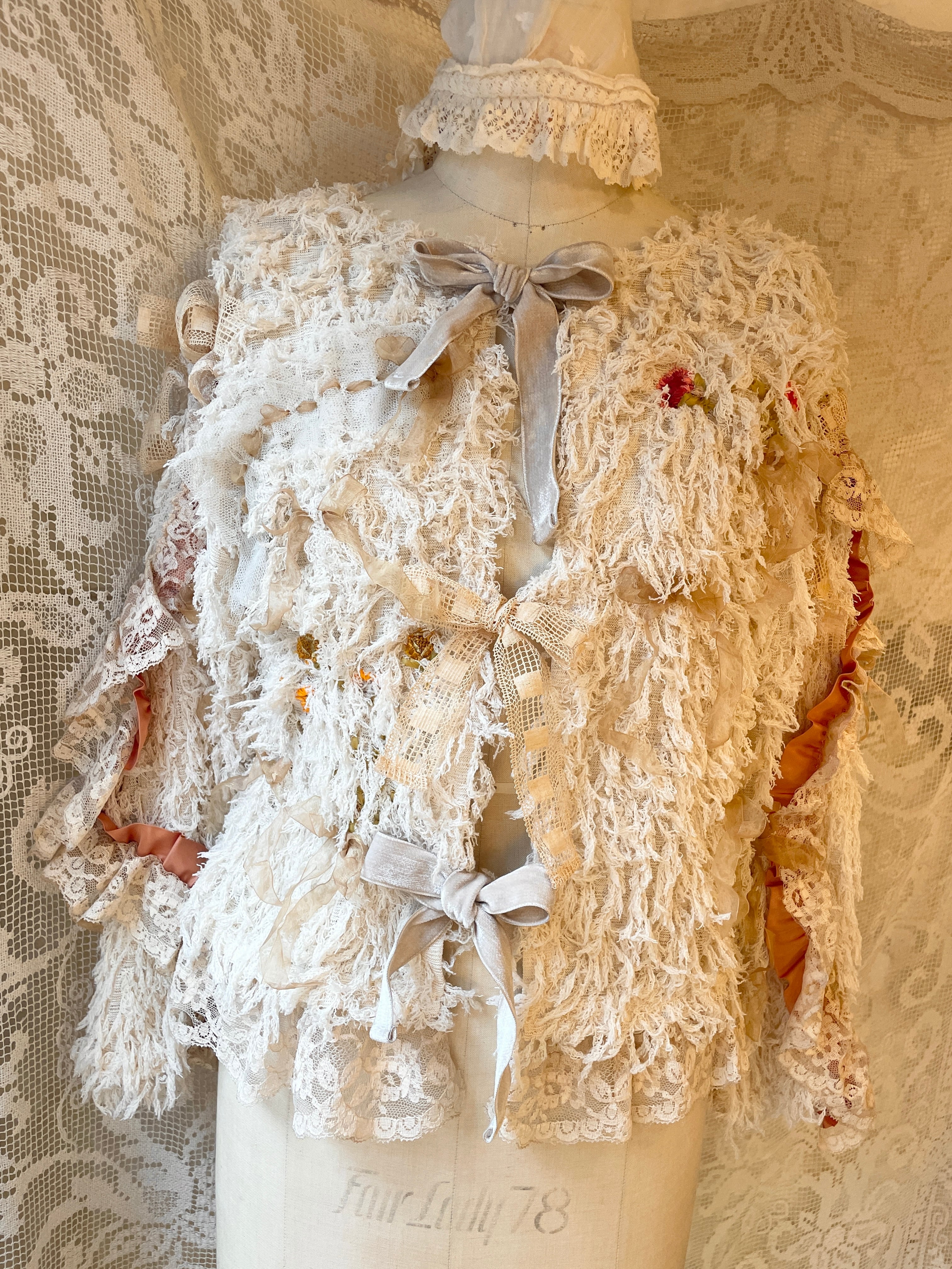 柔らかい毛足の長いカーディガンにvintageのレースやリボンをたっぷり装飾したデザインが可愛いです。