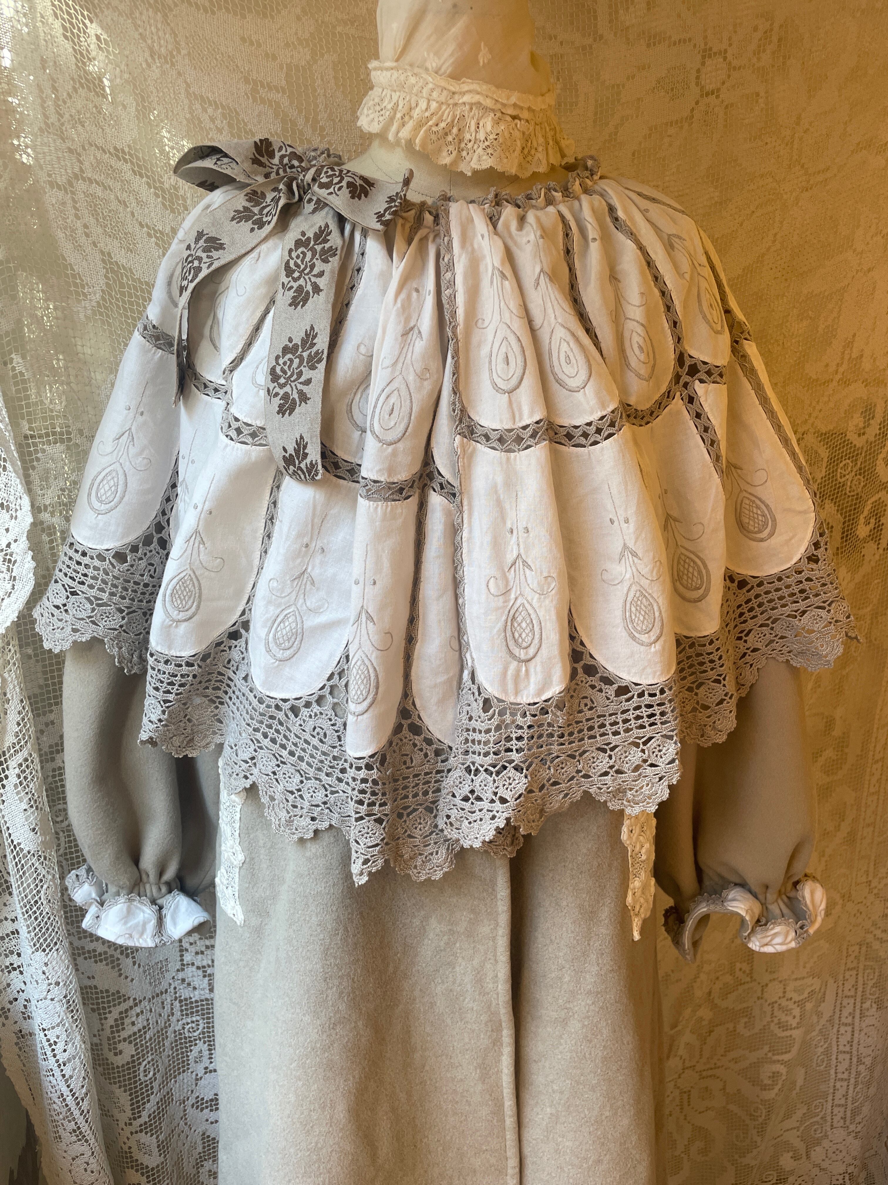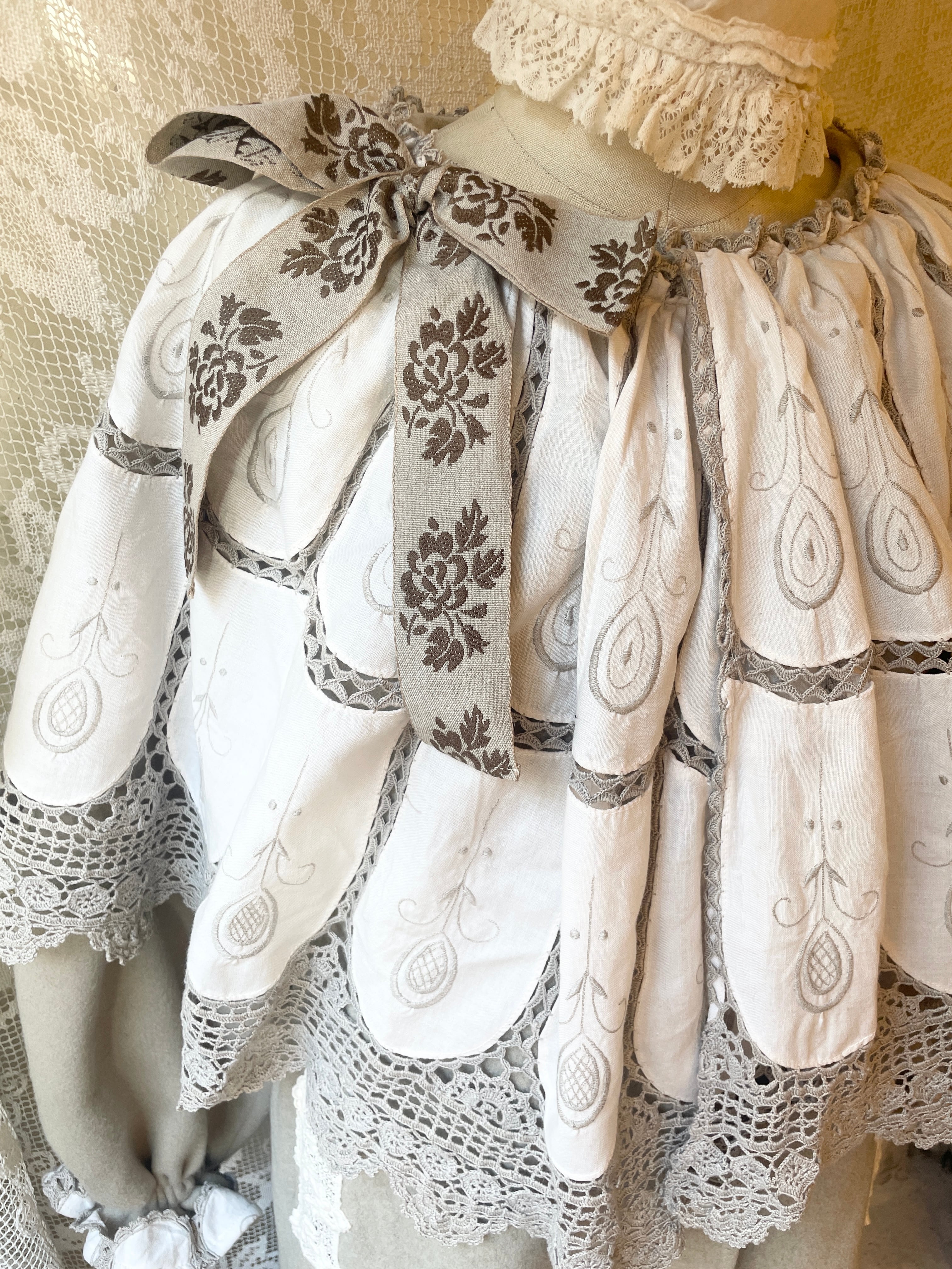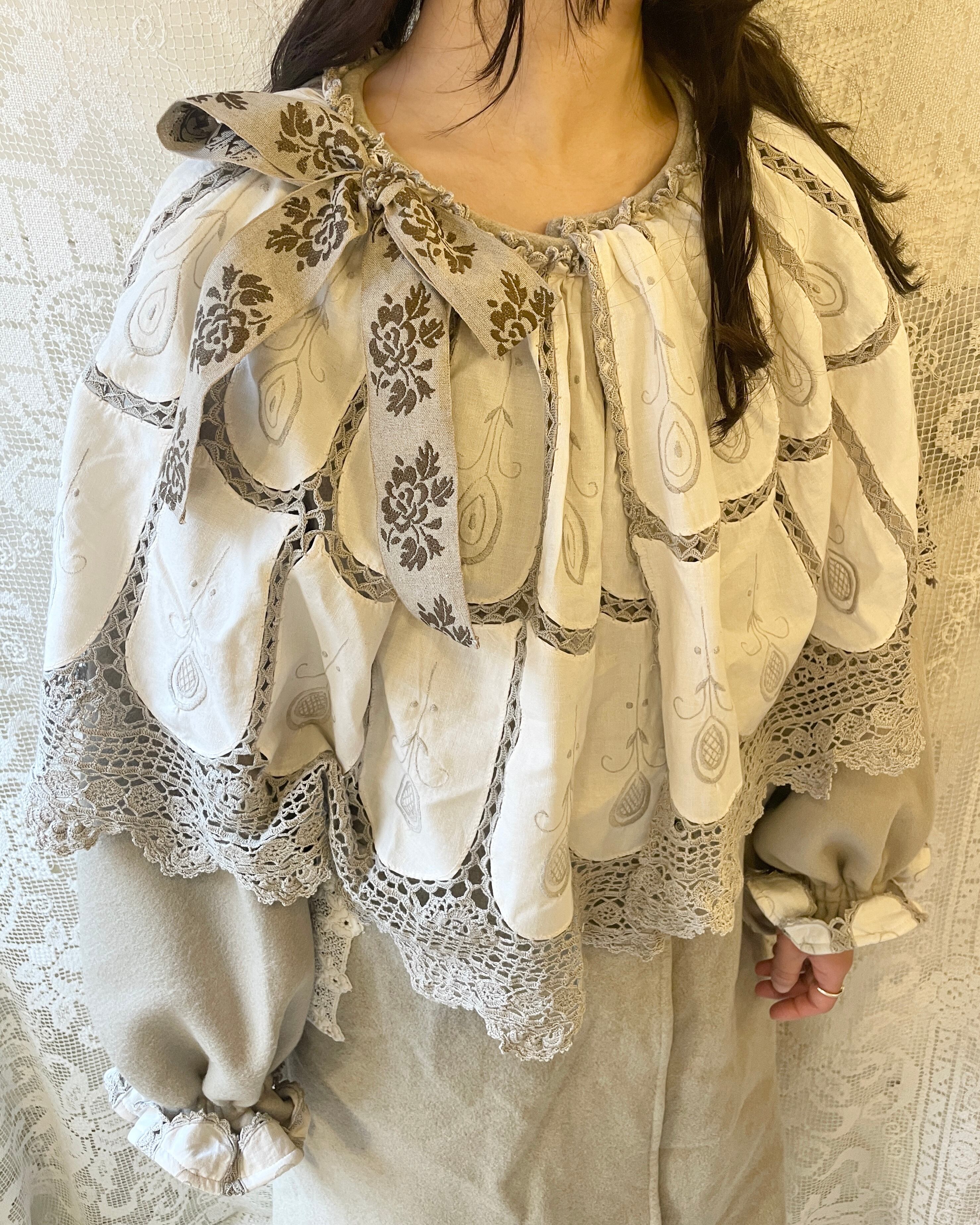 vintageクロスを贅沢に使用していて、胸元の大きなバラ模様のリボンもアクセントになっていてとても可愛いです。